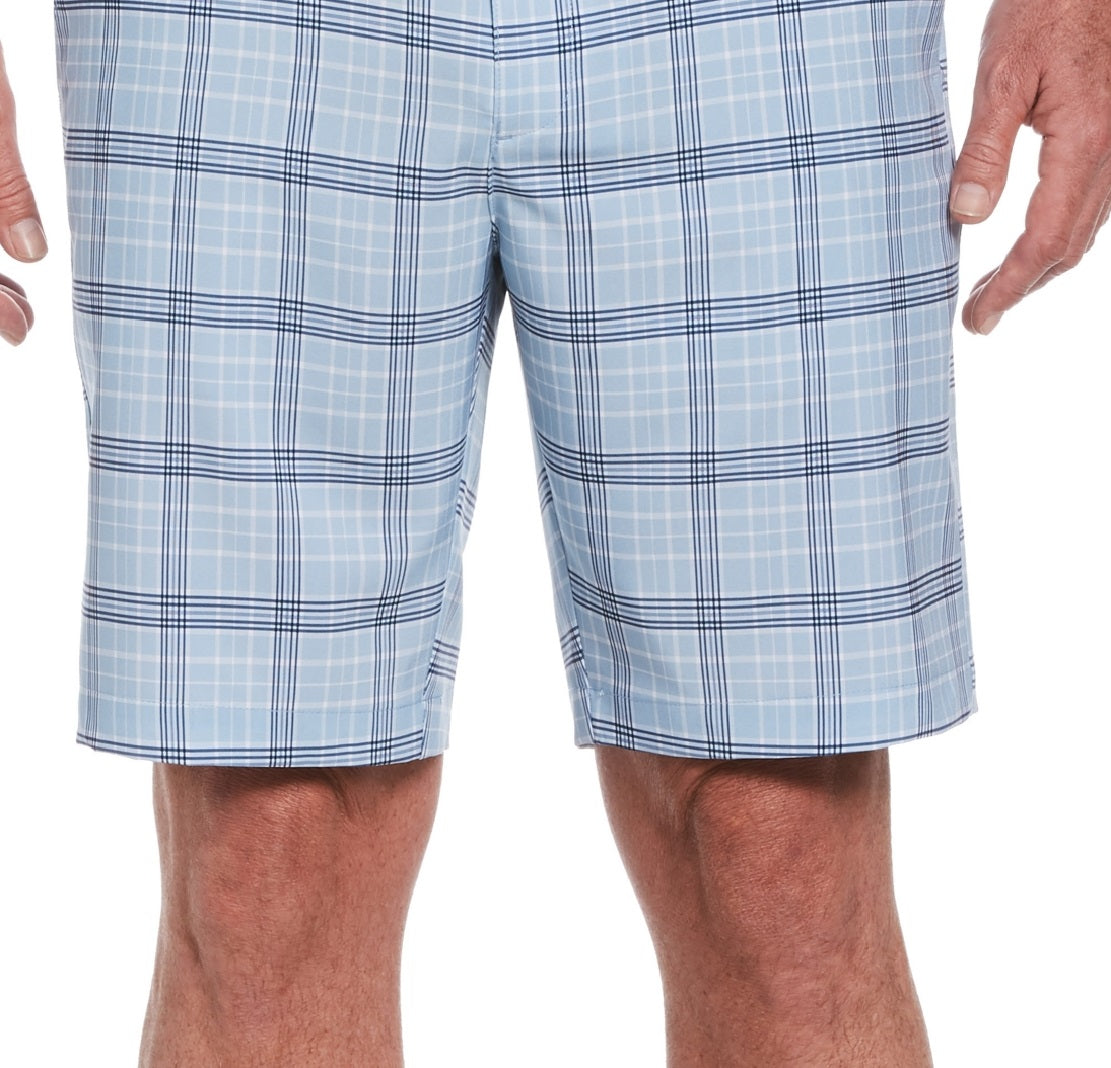 Show off your classic style on the course and off with these PGA Tour golf shorts featuring a timeless plaid pattern. Plain weave fabrication adds durability and is enhanced with stretch that moves with your every swing. These comfortable golf shorts feature front and back pockets that allow you to keep small essentials on hand.| Zip fly with button closure; belt loops| Hand pockets at front; pocket at back | Allover plaid print| Polyester/elastane| Machine washable| Imported
