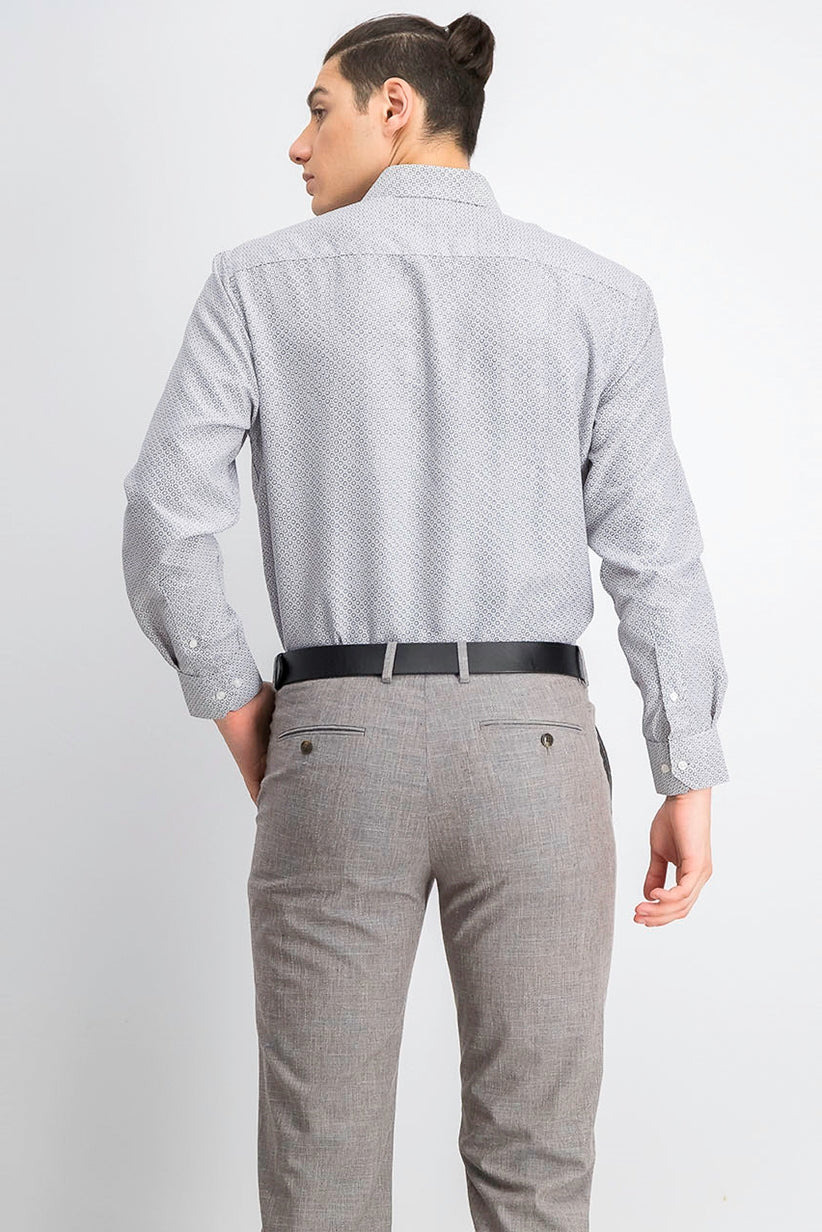 A slim fit is cut closer through the chest, sleeves and waist; features slim armholes and sleeves|Spread collar|Button cuffs|Geometric pattern; contrast dot-print detail at interior cuffs and collar|Wicking fabric helps evaporate moisture; wrinkle-free; quick-dry performance|Polyester|Machine washable