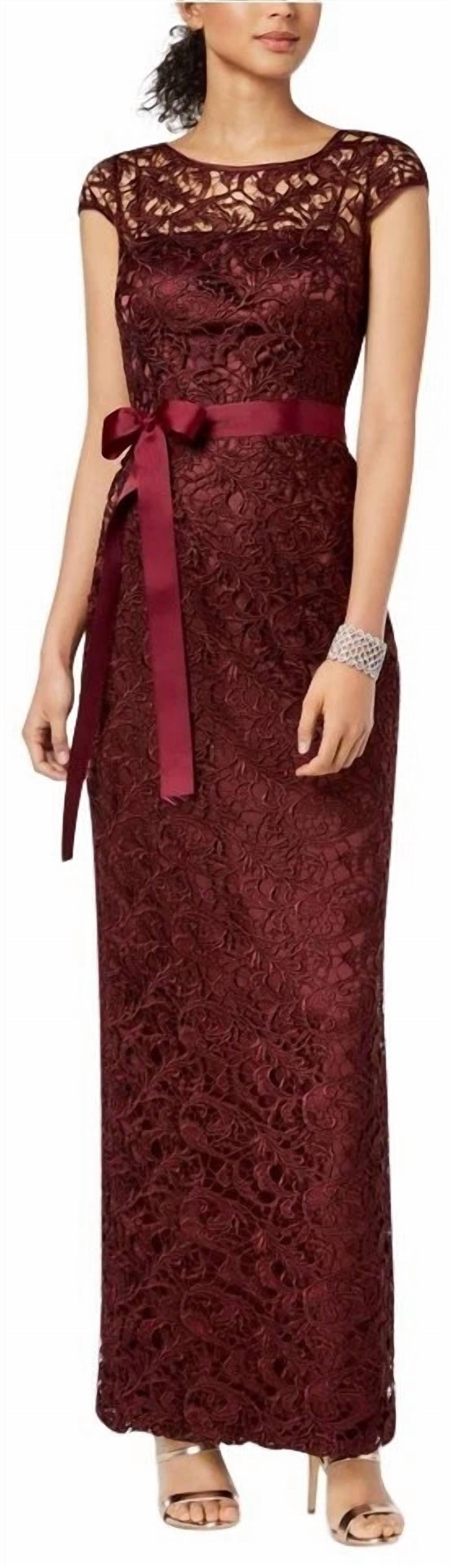 Elevate your evening wardrobe with the Adrianna Papell Boat Neck Lace Gown in timeless deep wine. This sophisticated gown features cap sleeves and a refined boat neckline, beautifully crafted from 100% polyester lace. It enhances the waistline with a unique tie-front detail. Closure: Zip closure. Care: Dry clean only. Perfect for an evening event, this gown embodies the quiet luxury trend.