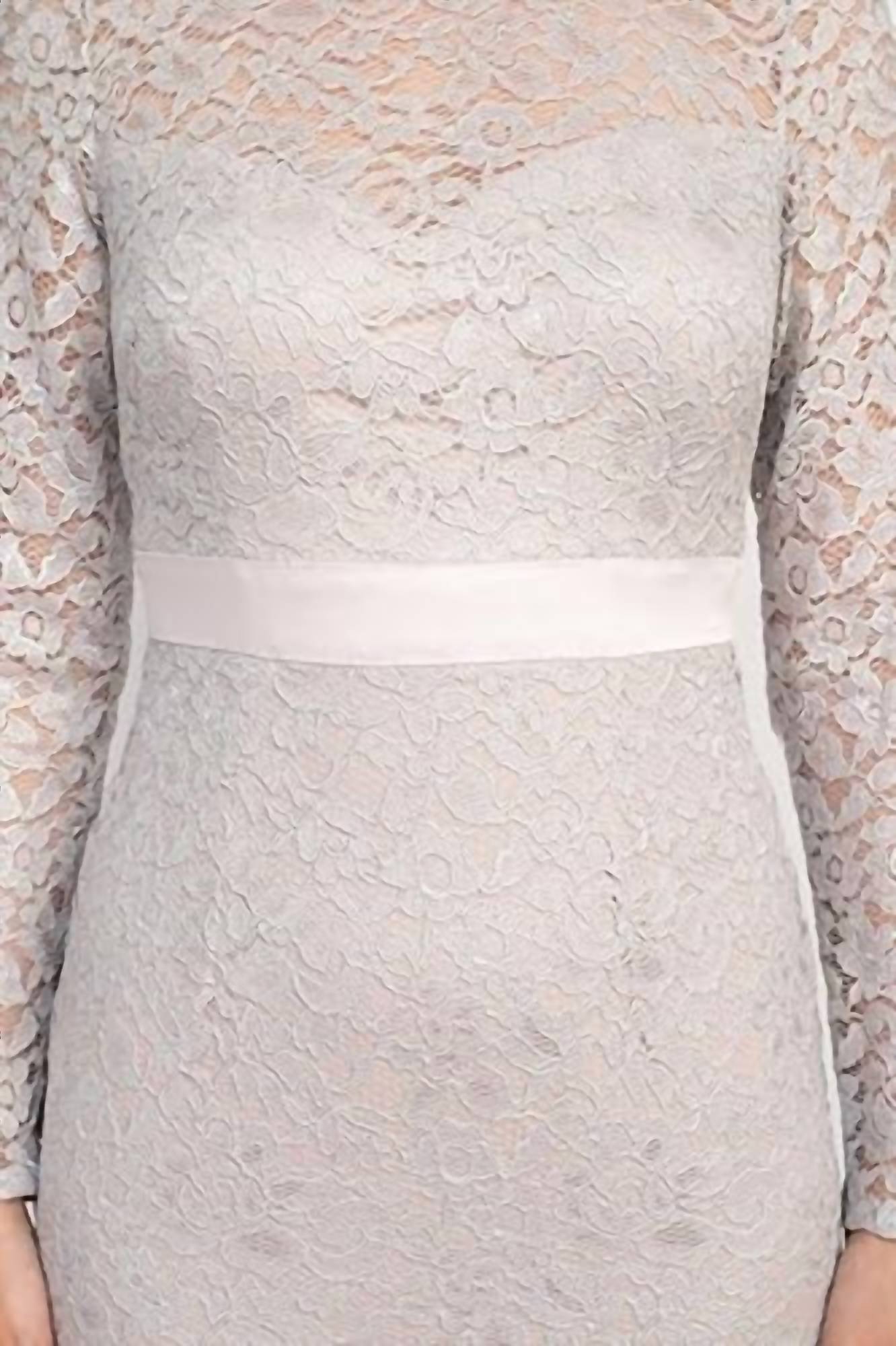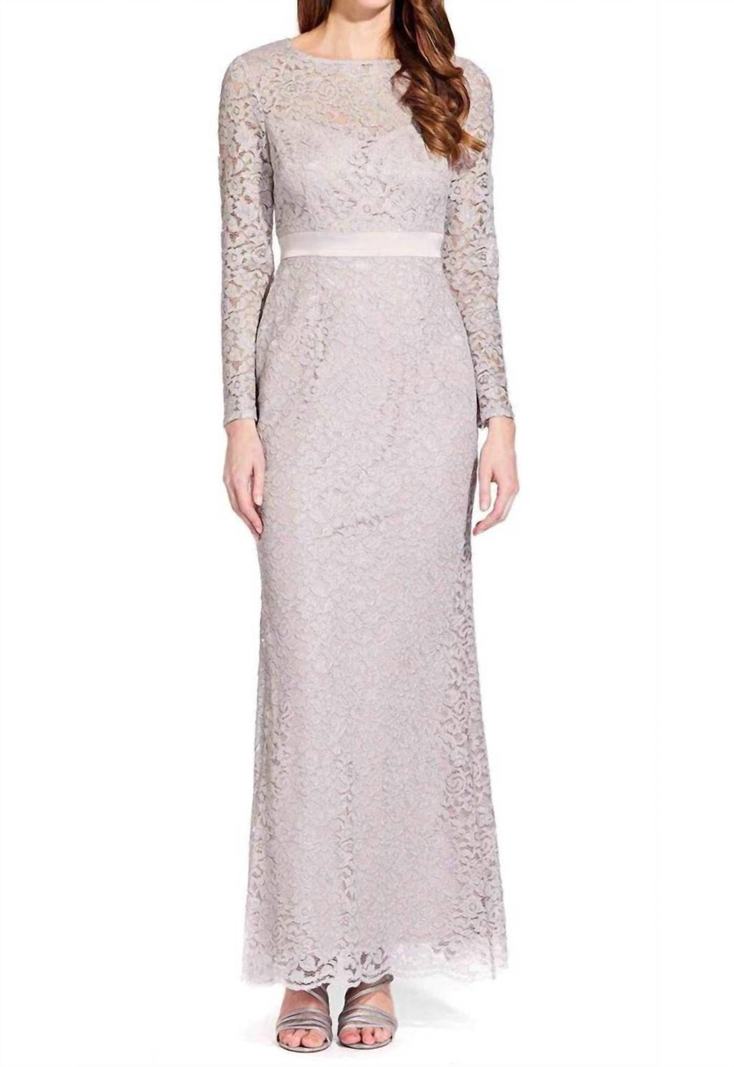Experience timeless elegance with the Embellished Keyhole Lace Dress by Adrianna Papell, perfect for weddings and formal events. This maxi dress features long sleeves and a crew neck, showcasing intricate lace detailing with a shimmering embellished design in icy lilac. Crafted in the US from 100% polyester, this dress ensures a sophisticated and luxurious appearance. Closure: Zip closure. Care: Dry clean only.