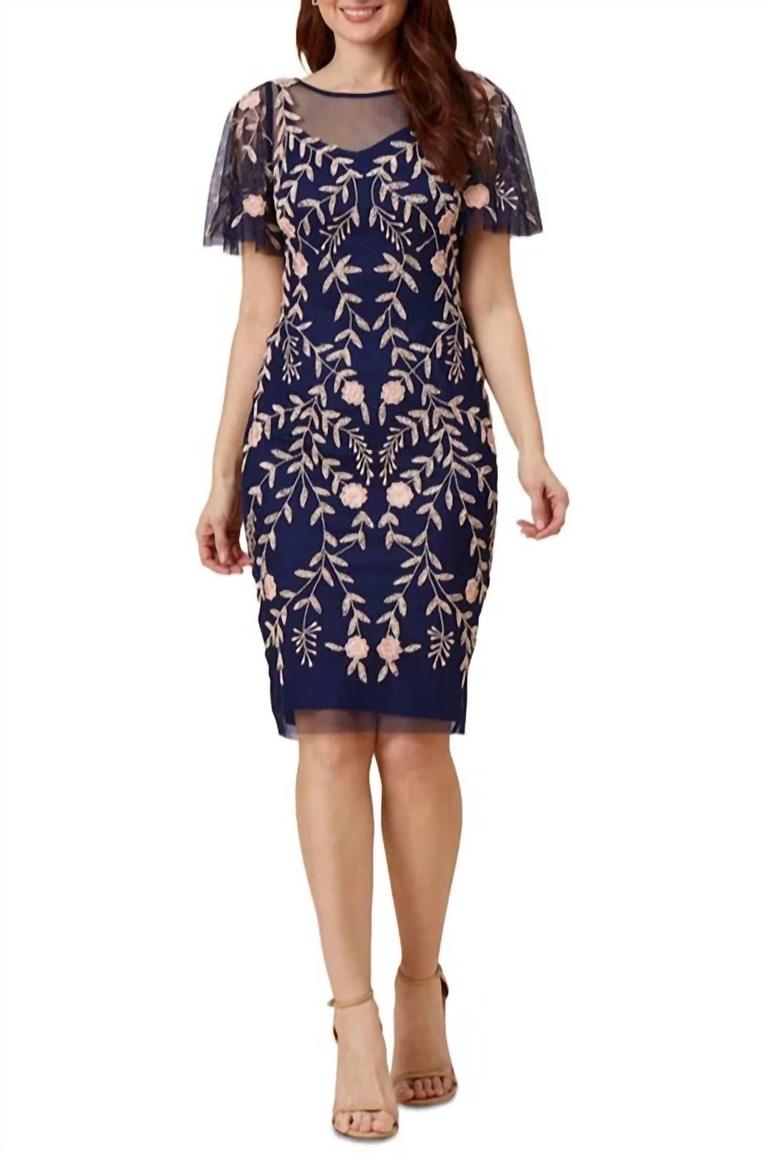 Introducing the Adrianna Papell Lutter Sleeve Sheath Sequin Dress in Navy Blush, an ideal choice for engagement celebrations. This dress boasts short flutter sleeves and a sheath silhouette adorned with sequins in a chic floral pattern. Made from 100% polyester, it is crafted in India, featuring a zip closure for easy wear. To maintain its glamour, dry clean only.