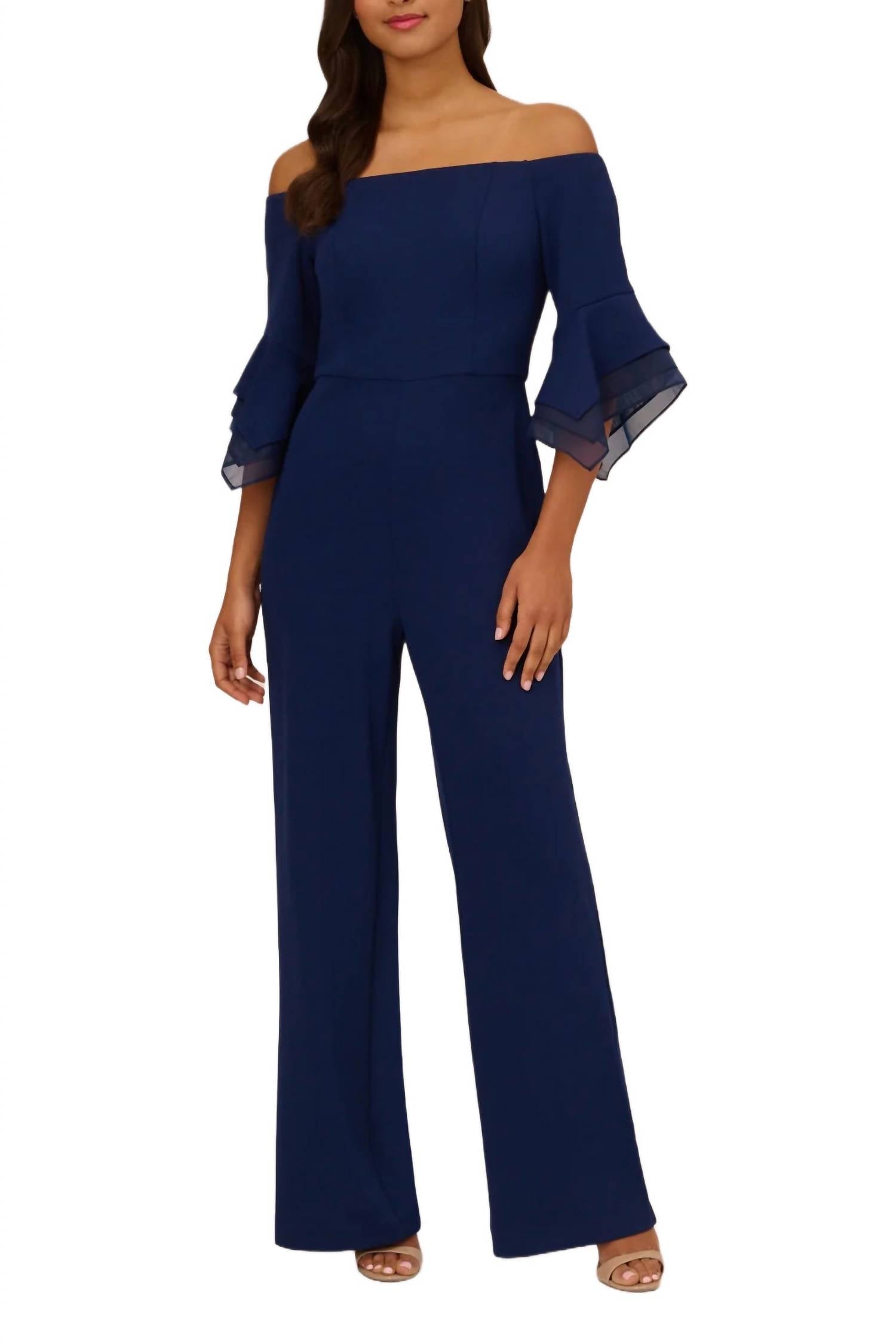 Elevate your style with the Adrianna Papell Off Shoulder Flounce Sleeve Jumpsuit, a chic addition in elegant navy sateen. Designed with flounce sleeves and crafted from 95% Polyester, 5% Elastane, this piece combines comfort with sophisticated style. Featuring a relaxed fit with a flared leg and a 32” inseam, it ensures a flattering silhouette for every occasion. Originating from a meticulous design process, this jumpsuit closes with a discreet zipper and requires dry cleaning to maintain its luxurious feel.