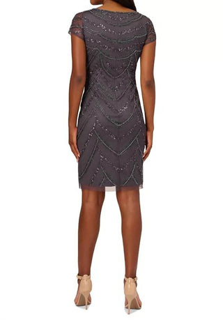 Adrianna Papell - Short Sleeves Back Zipper Short Beaded Mesh Dress