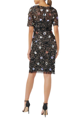 Adrianna Papell - Short Sleeves Back Zipper Short Beaded Dress