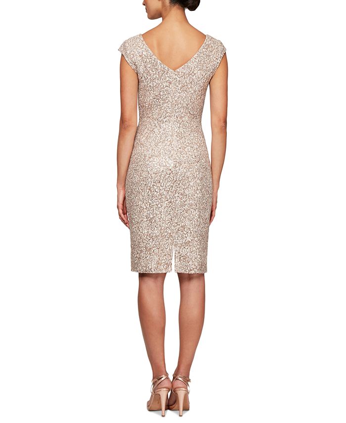 Lace; delicate and light texture|Sequins may shed during wear|Imported|V-neck; Sheath silhouette|Cap sleeves|Lined|Back zipper closure