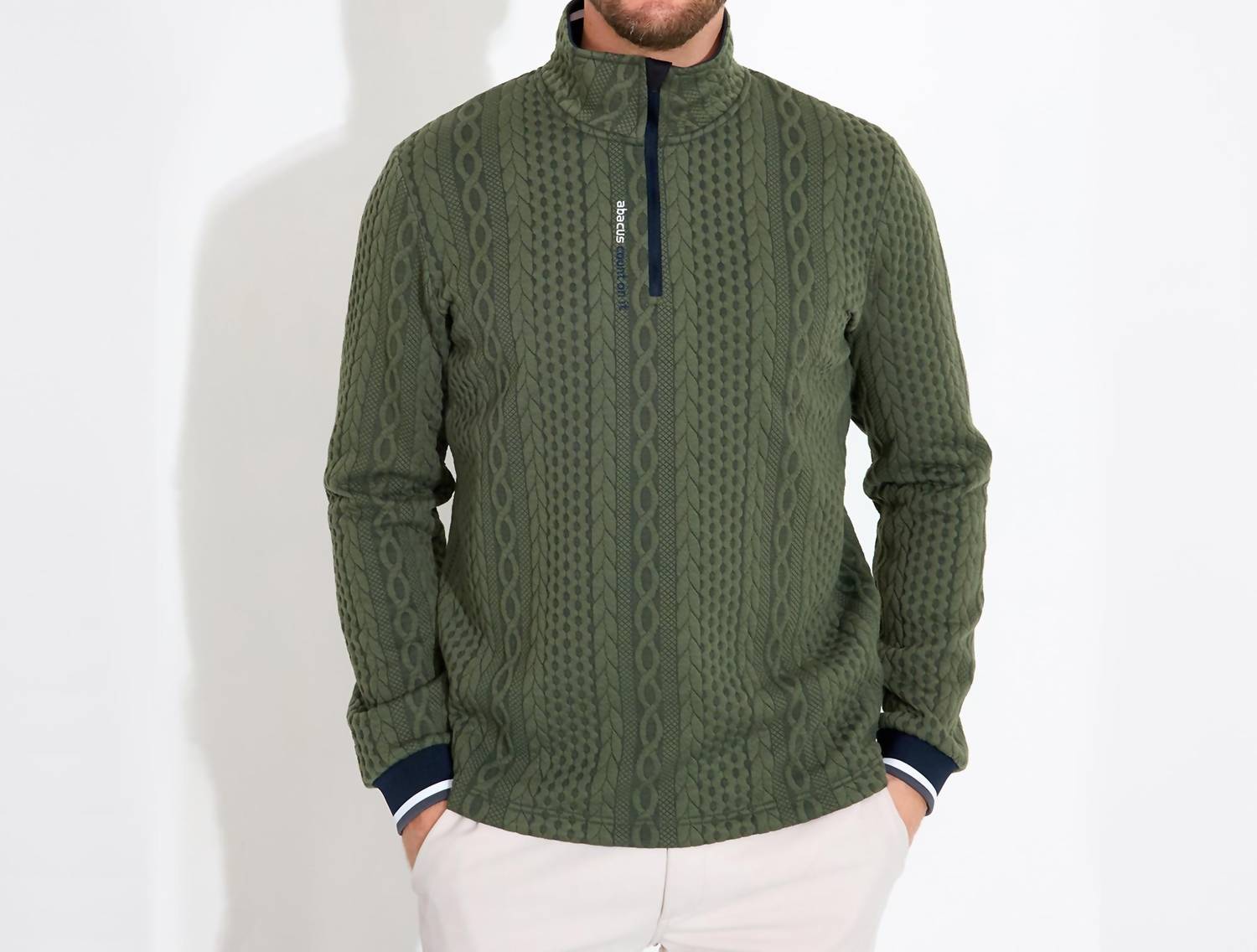 Fit to perfection and effortlessly chic. Introducing the Abacus Sportswear US Woburn Midlayer Half Zip Sweater, a perfect blend of style and function for the modern man. This long-sleeve sweater, crafted from stretchy knit material, features a cable knit pattern that adds visual interest. With a convenient zip closure and a mockneck design, it's an ideal piece for spring athleisure wear. Care for this forest-hued sweater is easy with machine wash and tumble dry instructions. Hampus, at 187 cm/6'1", shows off the medium size, demonstrating its perfect fit for game days.