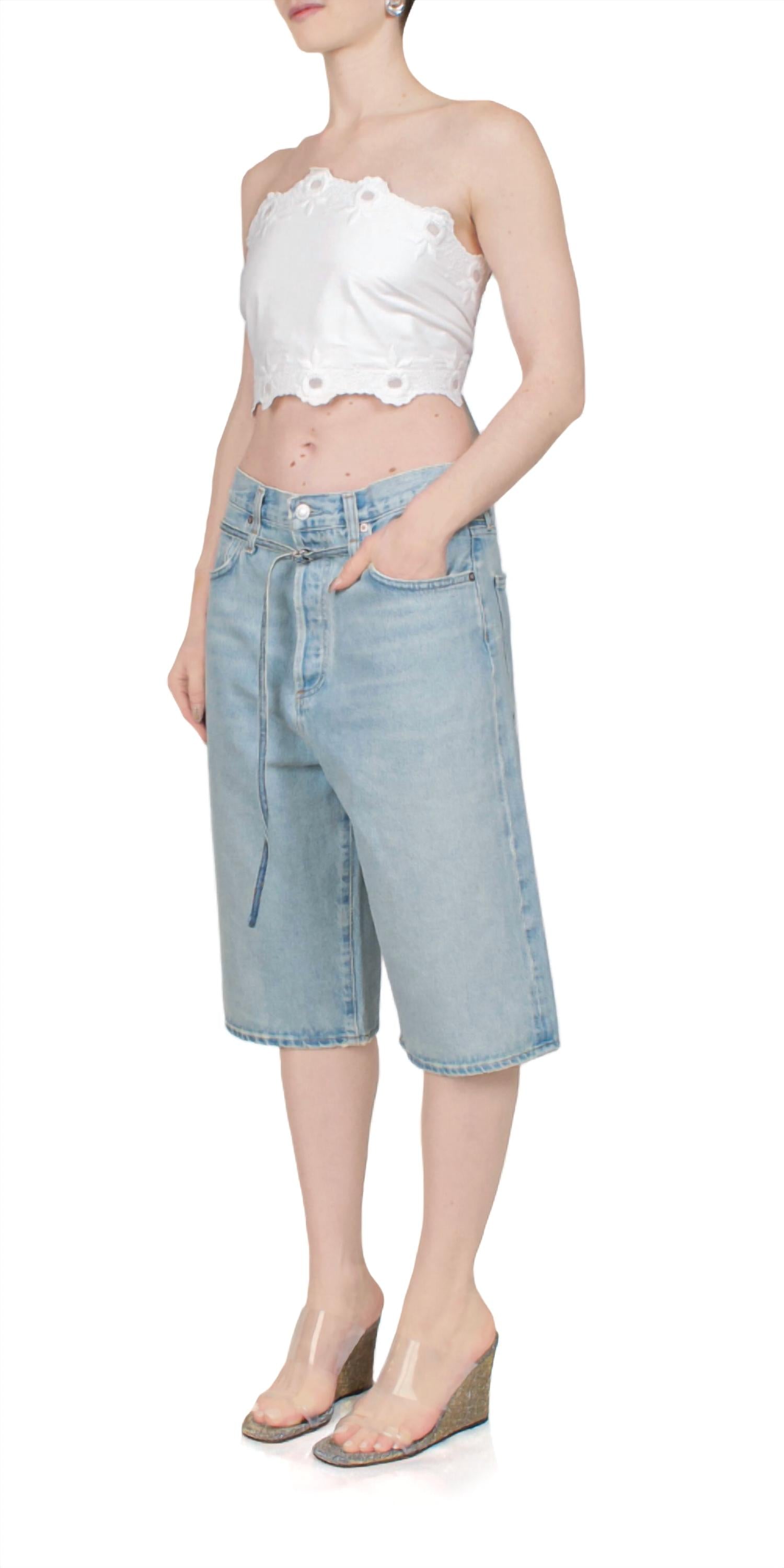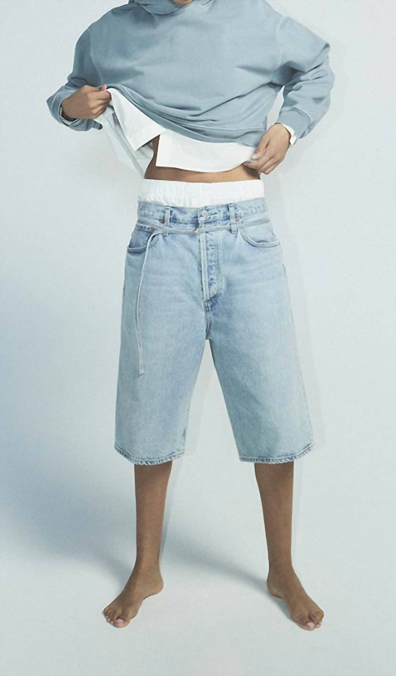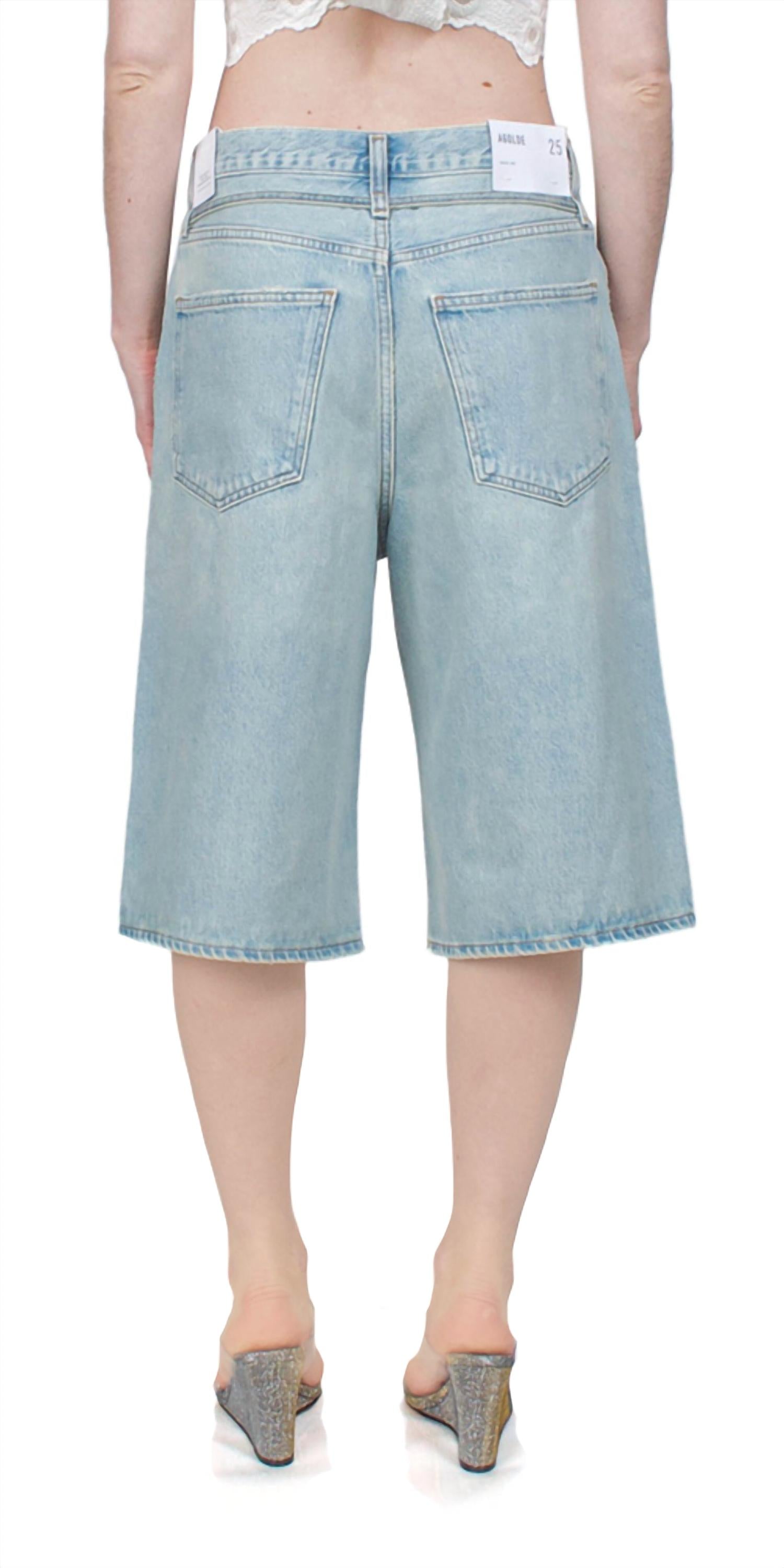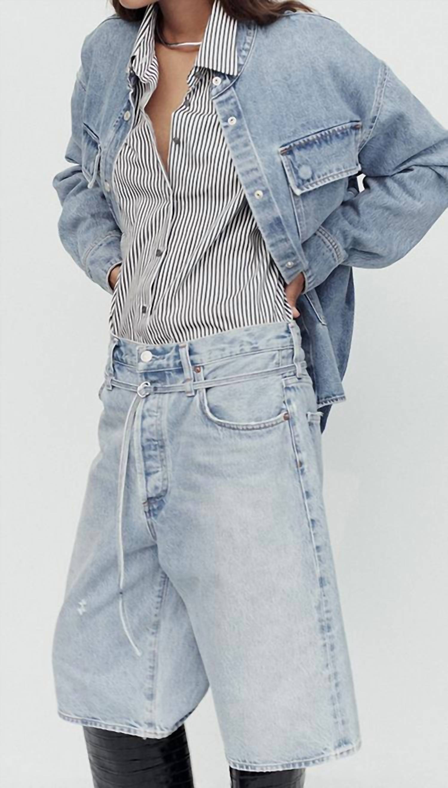 Introducing the Emmi Short by AGOLDE, a perfect addition to your summer wardrobe with its unique light washed out indigo shade, known as Replica. These shorts feature a zero stretch composition of 100% regenerative cotton, offering a sustainable choice. Designed with a zip closure, they boast a long inseam of 13 inches and a rise of 14 1/4 inches for that modern, slouchy look. Perfectly combining style and comfort, the Emmi Short fits true to size and includes functional pockets, making it a versatile choice for vacation outings. Model is 5'5" and wearing a size 25.