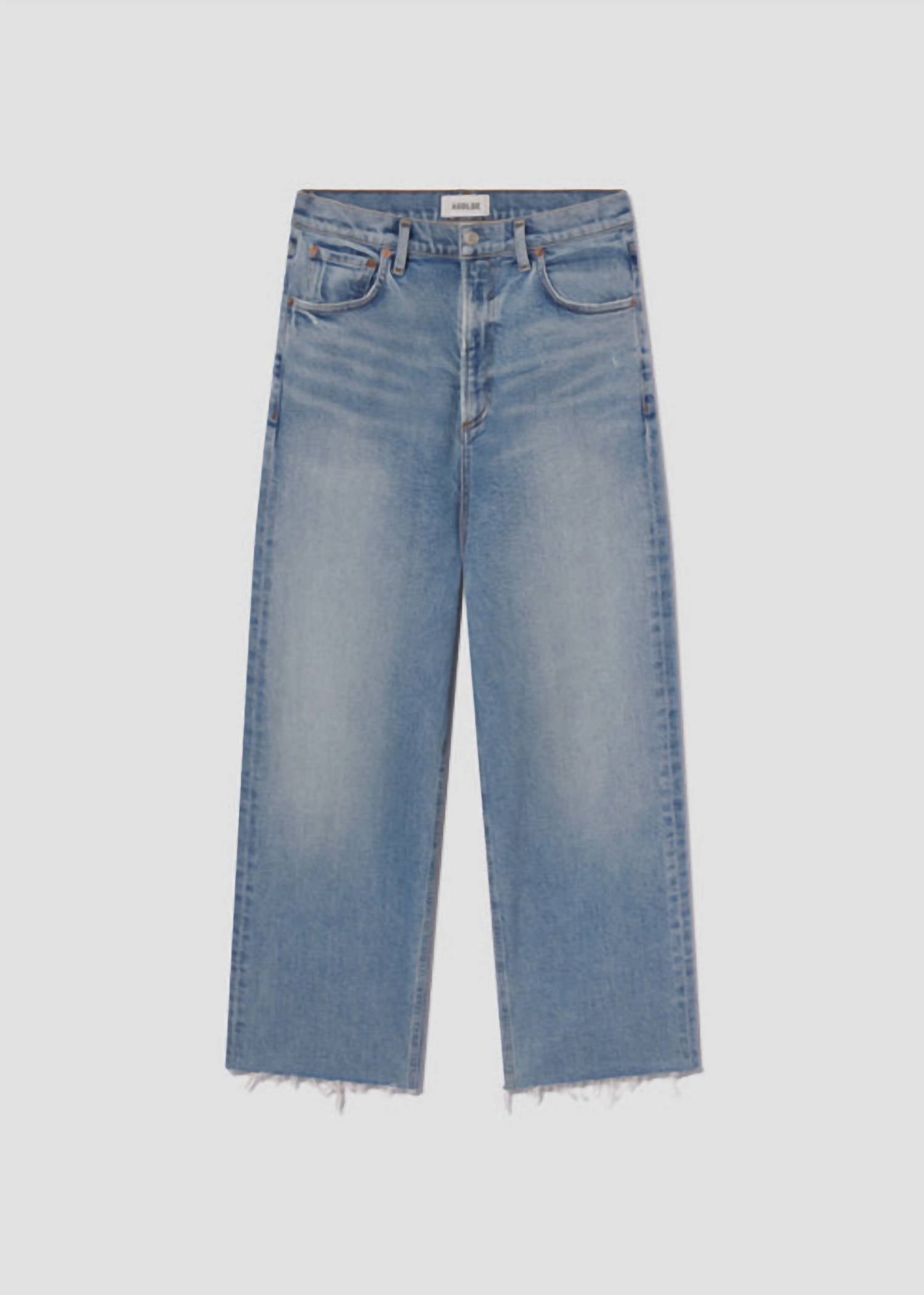 Embrace eco-conscious fashion with the AGOLDE Ren High Rise Wide Leg Jean in Forum, a hallmark of sustainable style. Constructed with a cotton blend comprising 99% regenerative cotton and 1% LYCRA® EcoMade Fiber, these jeans feature a relaxed fit and a wide leg design, providing signature comfort stretch for effortless wearability. Boasting a 12.24" high rise waist, a 27.5" inseam and leg opening: 19 1/2", these jeans offer uncompromising recovery and durability, all dyed with Eco-Indigo for a vibrant hue. Finished with a button and zipper fly closure, these jeans are made in Turkey and are easy to care for with machine wash cold and tumble dry low instructions. Pair them with a sleek bodysuit or relaxed top for a chic, minimalist look.