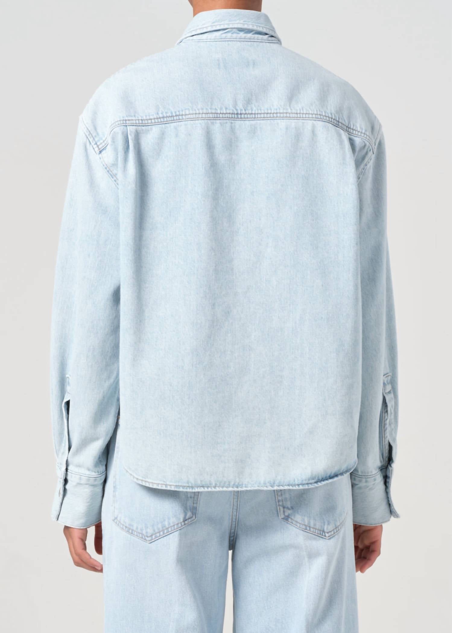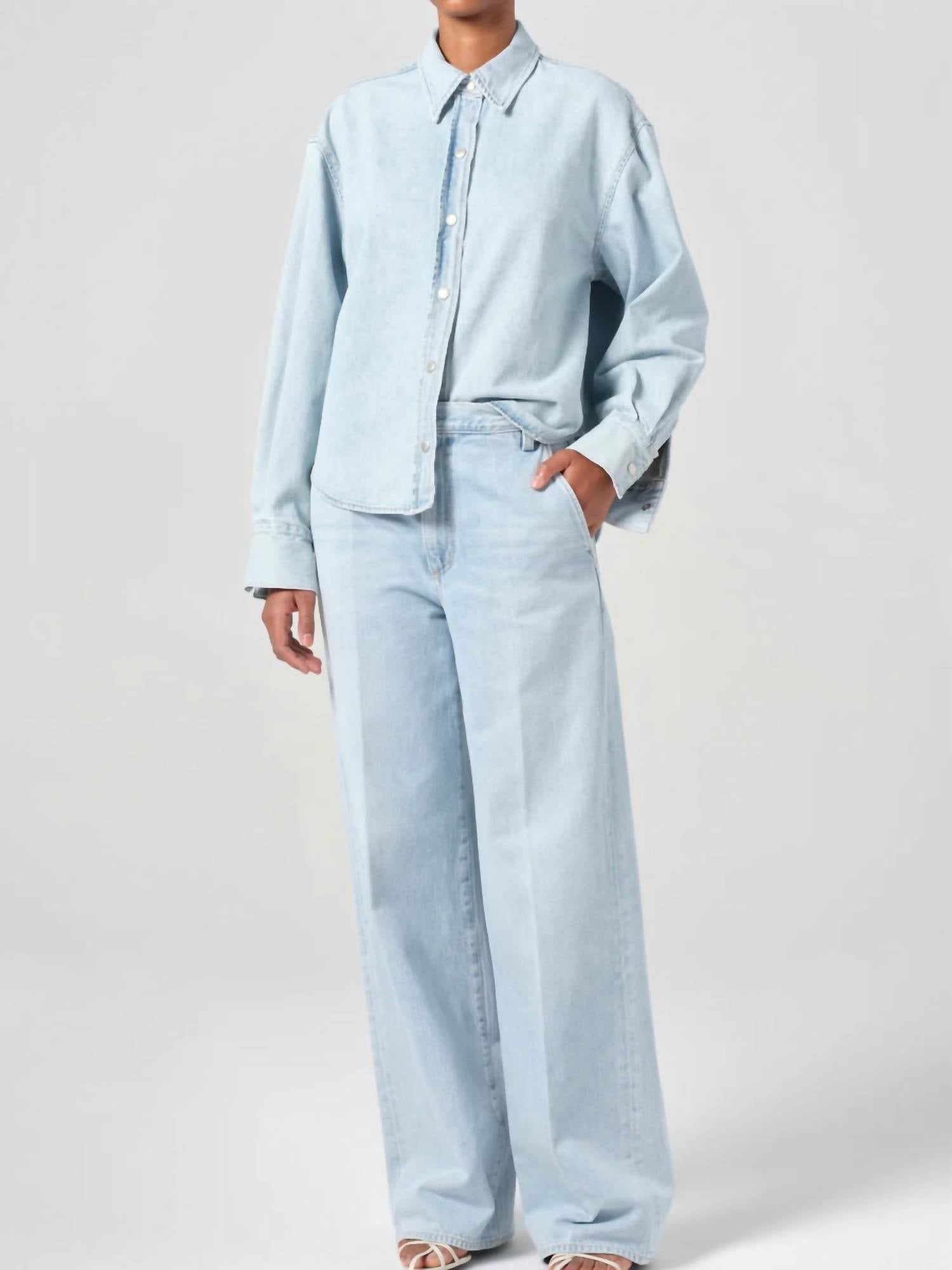 A classic button down shirt that will never go out of style. Discover the AGOLDE Women's Denim Shirt in a bold Cluster hue, ideal for streetwear style on your next vacation. This solid, long-sleeve shirt features a classic collared neckline for a timeless appeal. Made for women who appreciate effortless chic, it's perfect for spring adventures.
