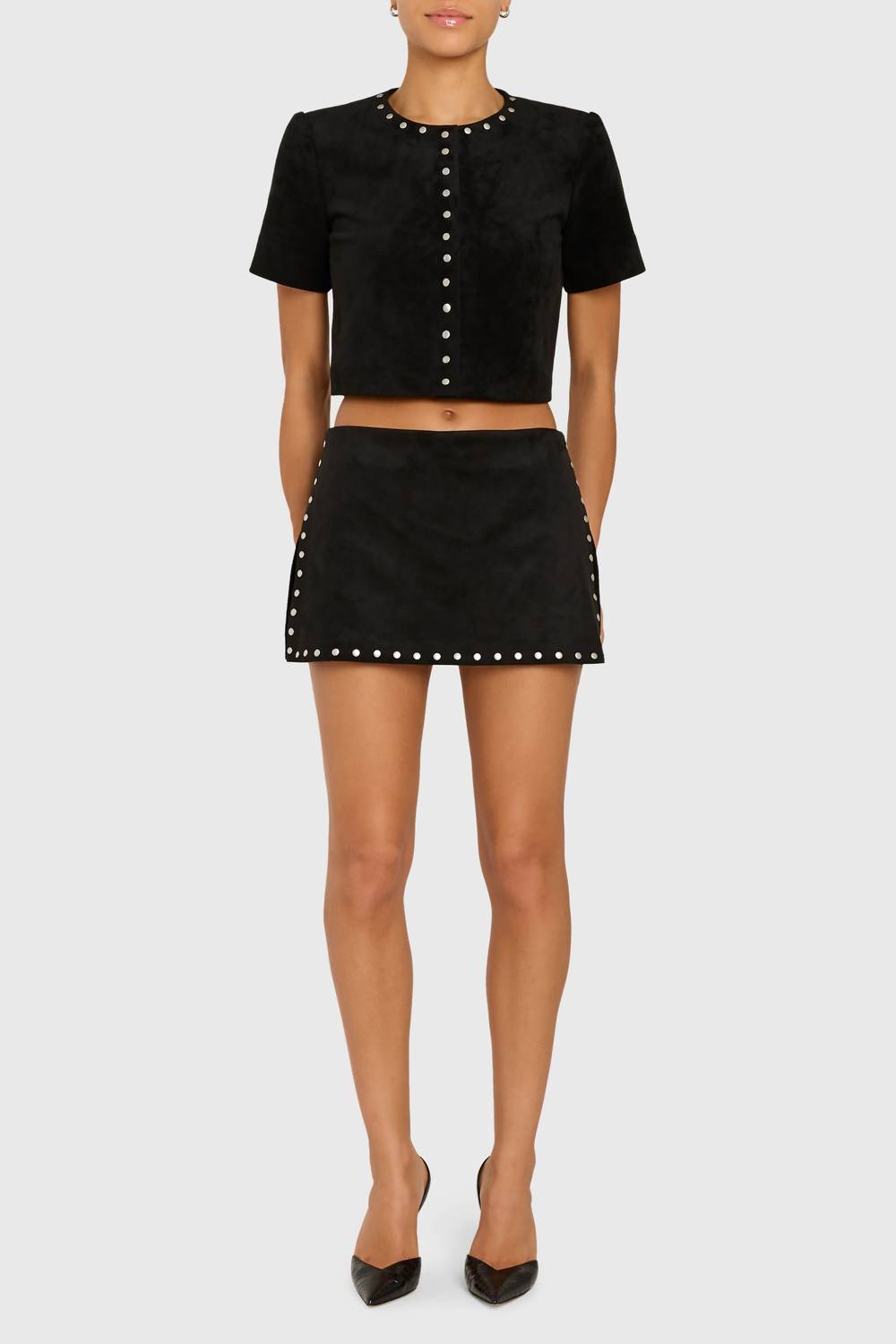 Introducing the Amanda Uprichard Braswell Suede Top, a sophisticated addition to your wardrobe with a black monochrome aesthetic and retro-inspired gold button details. Featuring short sleeves and a solid pattern, this women's cropped top is crafted from a self-blend of 95% polyester and 5% viscose, with a 100% polyester lining. It boasts a crewneck design and convenient snap closure for easy wearing. For best care, this top requires dry cleaning only.