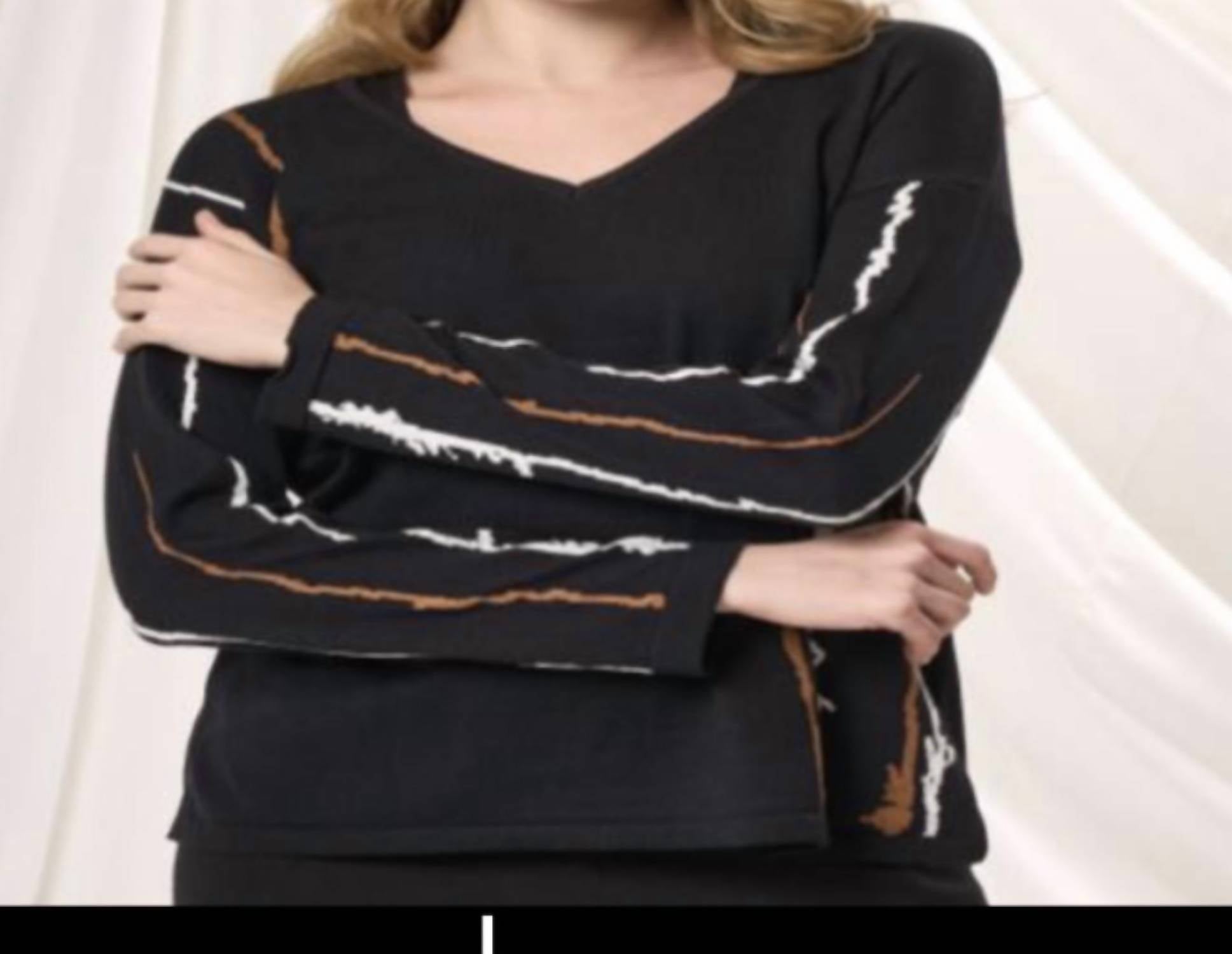 This is a black V-neck top with abstract white and orange stripe details on the sleeves and bodice.