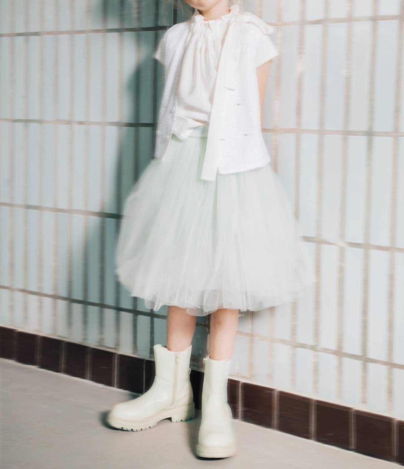 The Girl's Tutu Skirt by Anja Schwerbrock is an elegant choice for holiday parties, crafted in a solid ivory hue. This midi-length skirt features an asymmetrical closure and several layers of tulle, satin, and cotton, providing beautiful volume and a minimalist appeal. Designed in a cotton blend, it is perfect for spring occasions such as Thanksgiving. Make this charming tutu a standout piece in her wardrobe.