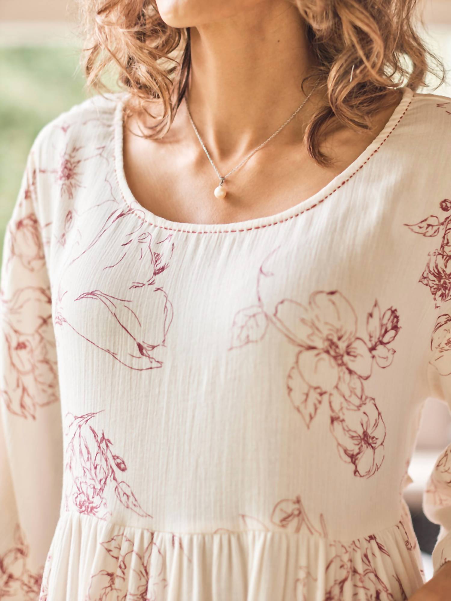 The April Cornell April's Rose Midi Dress is an elegant addition to your wardrobe, capturing floral charm in soft double cotton gauze. This dress features three-quarter wide sleeves and intricate stitching with front patch pockets for added detail. Made from 100% cotton, it includes a scoop neckline and a button tie back waist, with a length measuring 46 inches. Care for this beautiful garment with a gentle machine wash in cold water and hang to dry. Genevieve is 5'9" and wearing a size small.