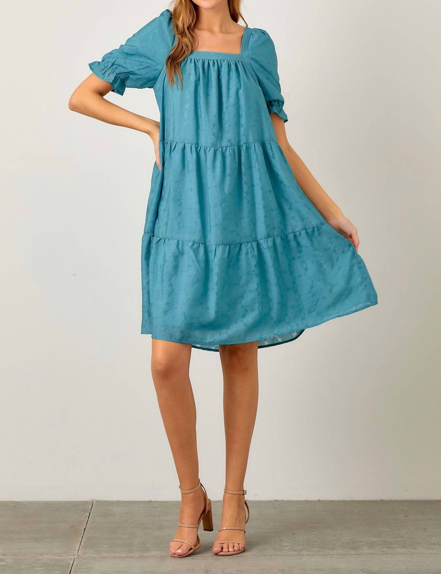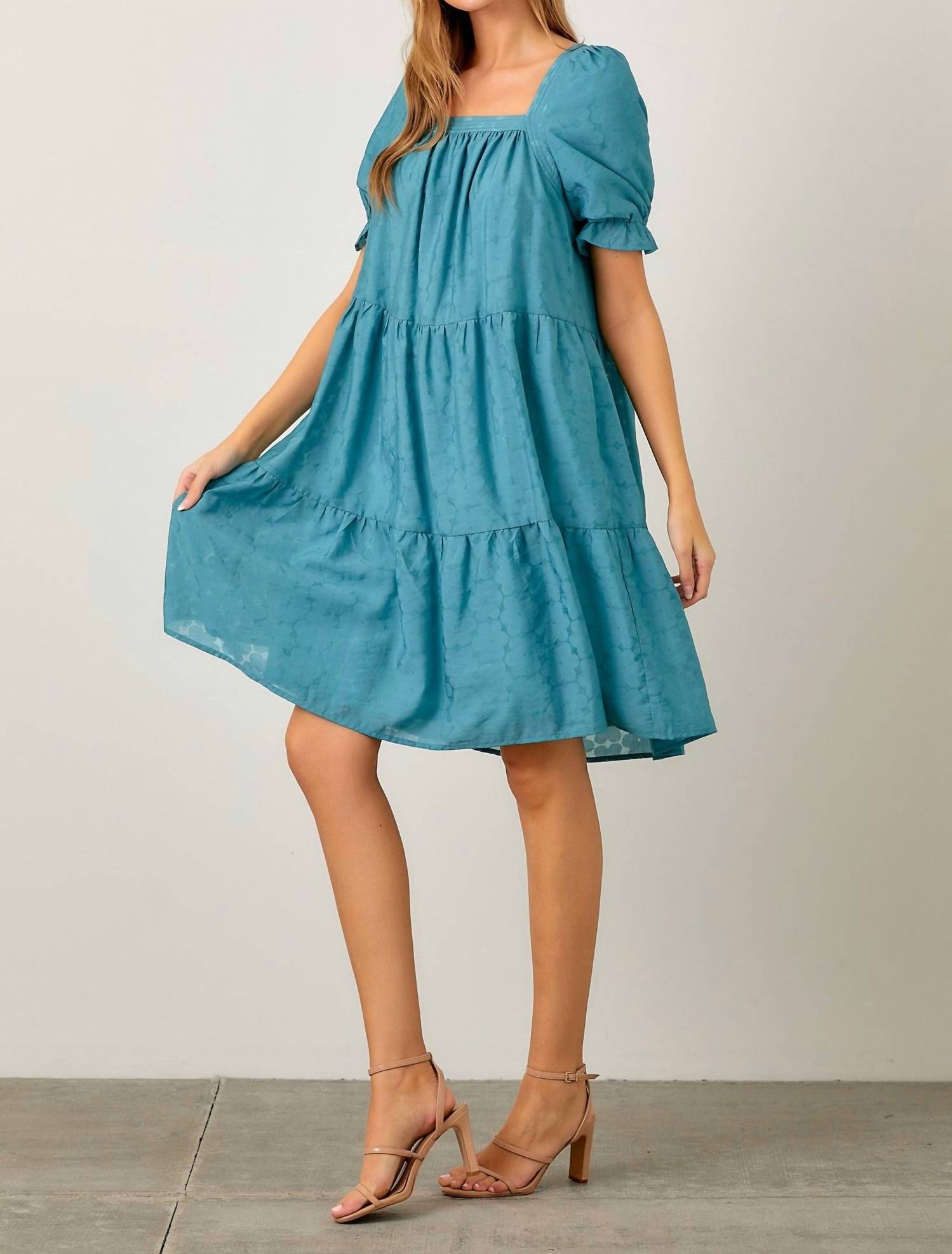 The kind of easy and flattering dress you'll be reaching for all season long. Discover the charming Keaton Floral Burnout Tiered Dress by Baevely, a must-have for your summer wardrobe. The short ruffled sleeves and ribbed square neckline combine with a playful tiered design to flatter any body type. Crafted from soft 100% Polyester in a rich teal floral pattern, it effortlessly embodies boho chic style. With a pull-on closure, this mini shift dress is a perfect choice for holiday parties and other occasions.