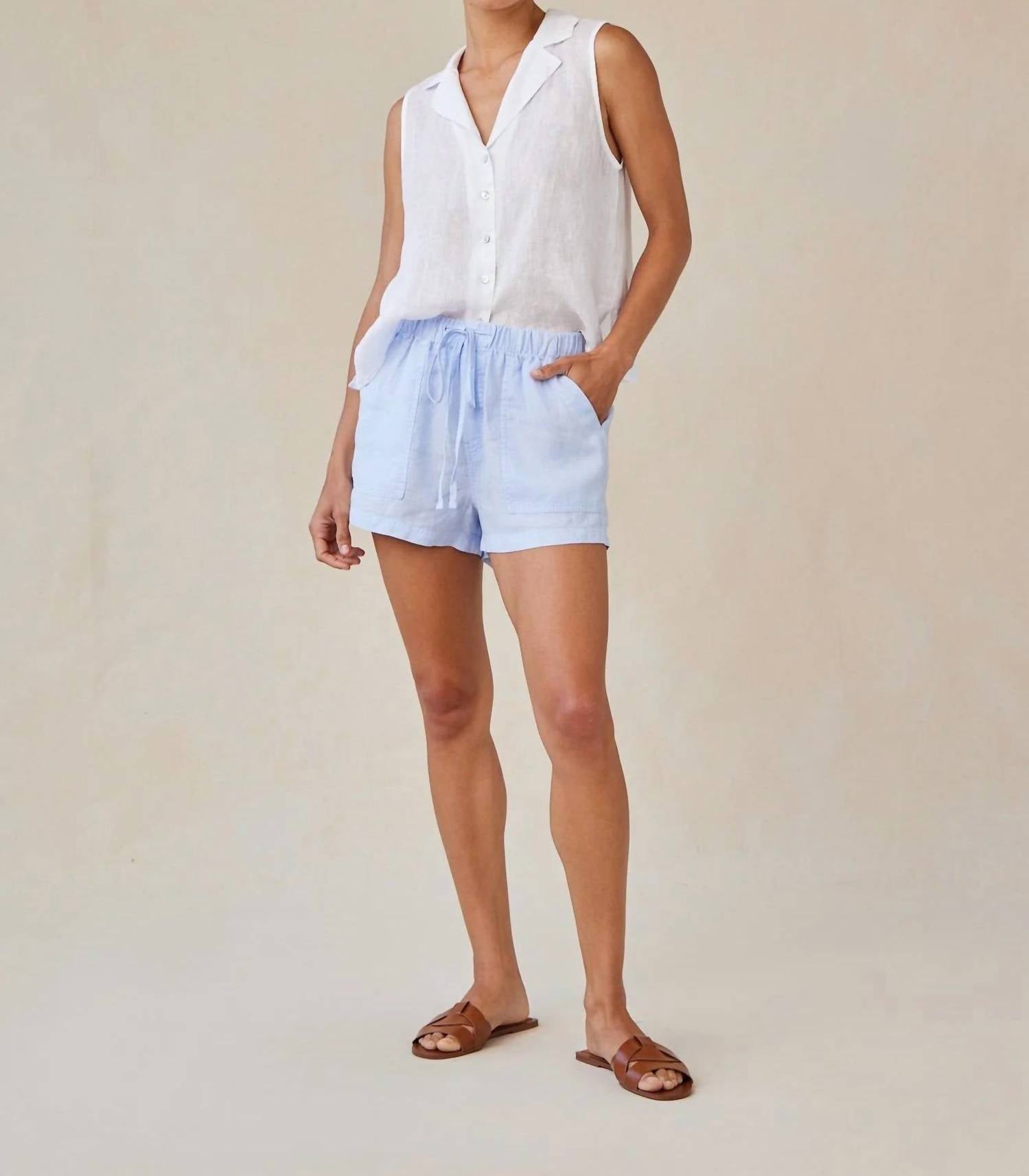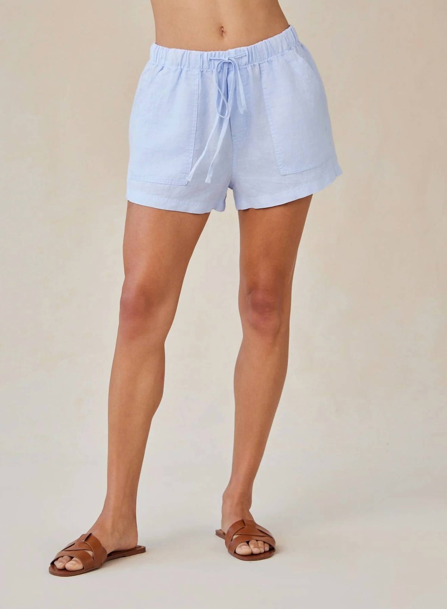 High-waist is here to stay and we especially love this style short. Embrace effortless summer style with Bella Dahl's Linen Pocket Short, crafted in a breezy 100% linen fabric. This perennial blue high-waist short features an elastic waistband with a drawstring tie for a customizable fit. Designed with both front and back pockets, it offers practicality while maintaining a sleek, minimalist look. Care for your shorts with a simple machine wash cold. Model is 5'10" and wearing a size XS.