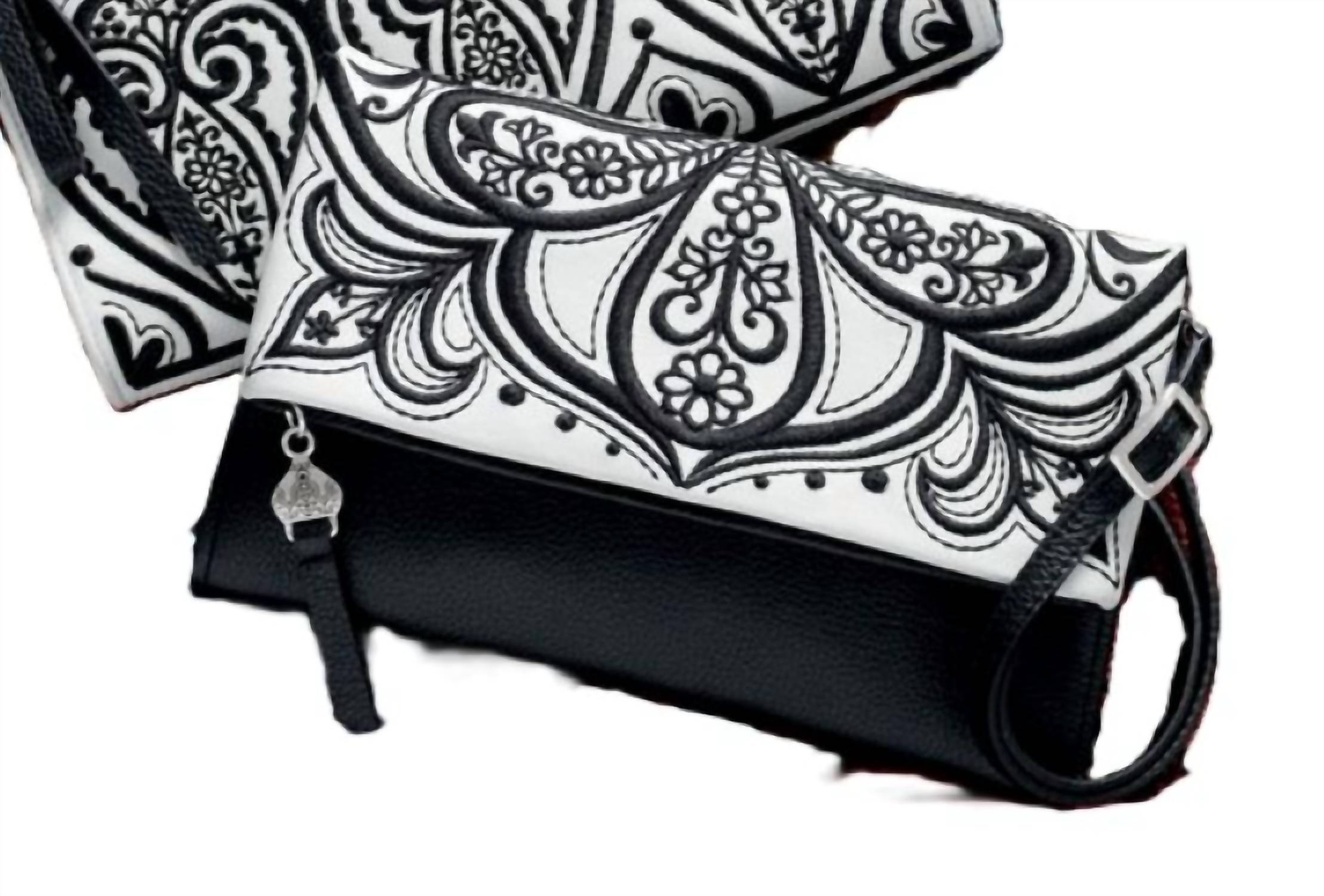 All Leather. Magnetic flap closure. Embroidered detail on front flap. Inside snap closure. Inside zippered pocket and two open pockets. Clear ID window. Slot pocket for paper money. 10 slots for credit cards. Long adjustable crossbody leather strap.
