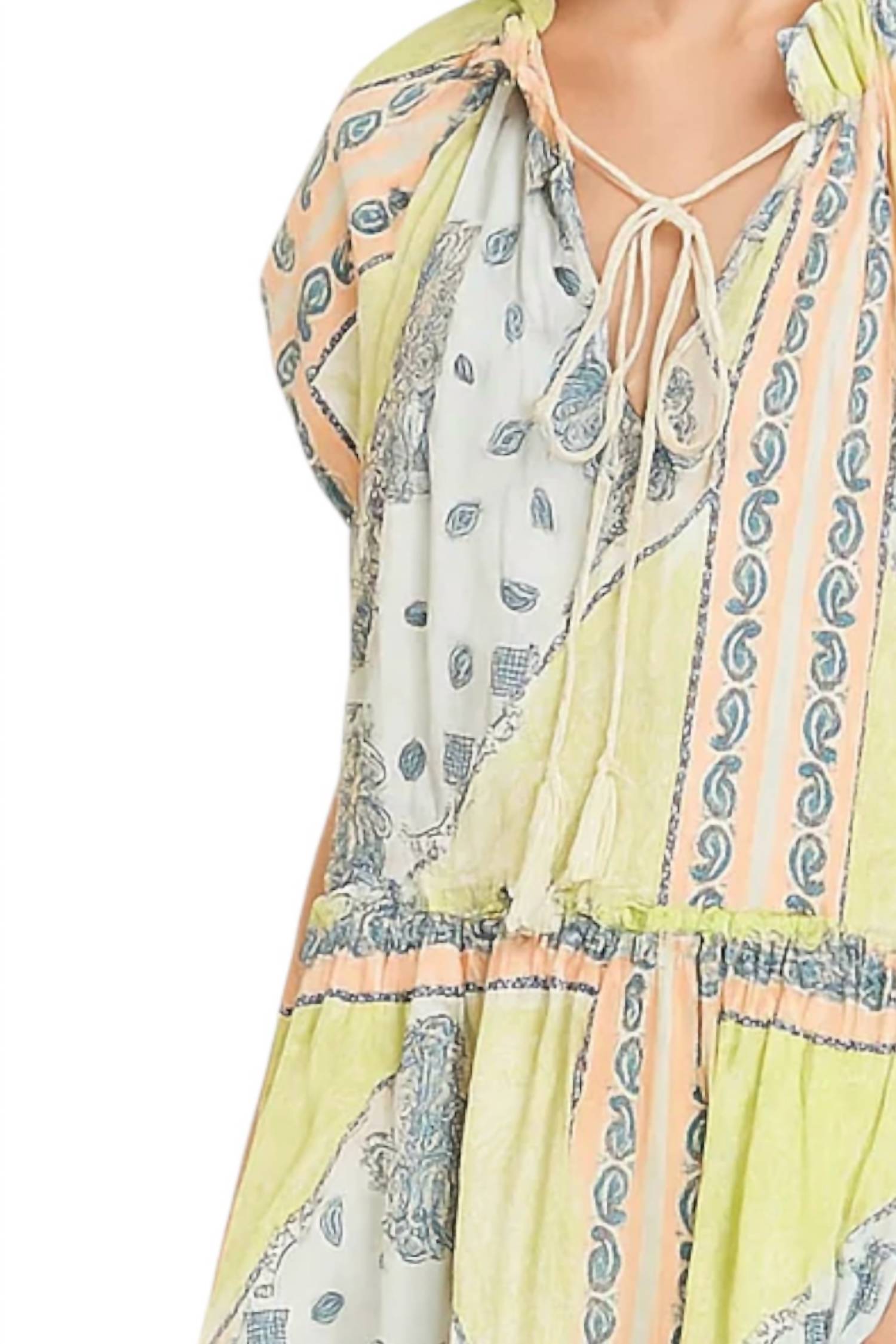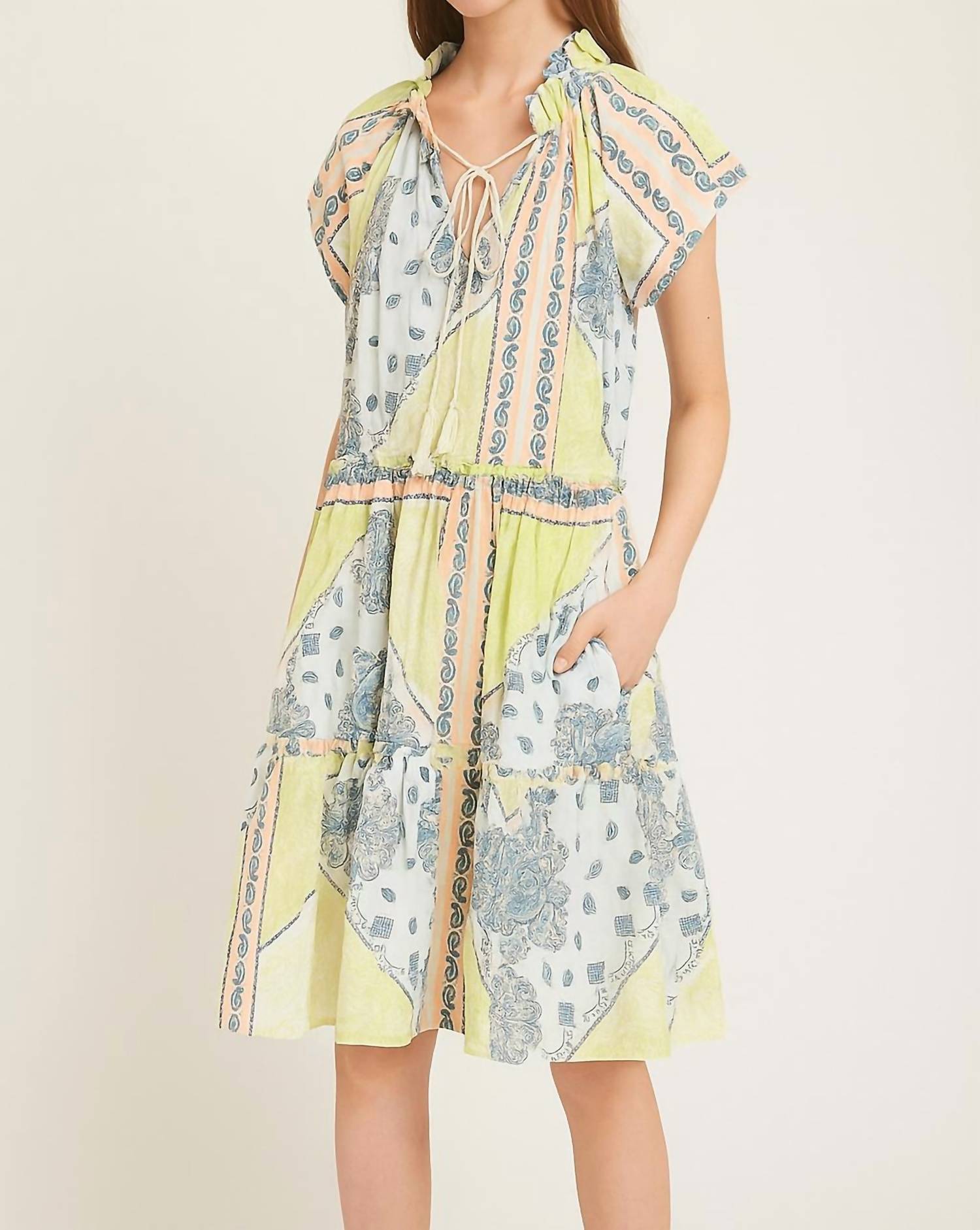 Introducing the Dayna Mini Dress by Double A, a must-have for warm-weather adventures in the fresh Apple Bandana pattern. This shirt dress showcases short flutter sleeves and a relaxed fit, crafted from a lightweight, breathable fabric for ultimate comfort. It features a V-neckline with an adjustable tie closure and practical pockets, while the tiered skirt adds a feminine touch. Designed to hit above the knee, this versatile piece is perfect for a laid-back vacation style. Care: Machine wash.