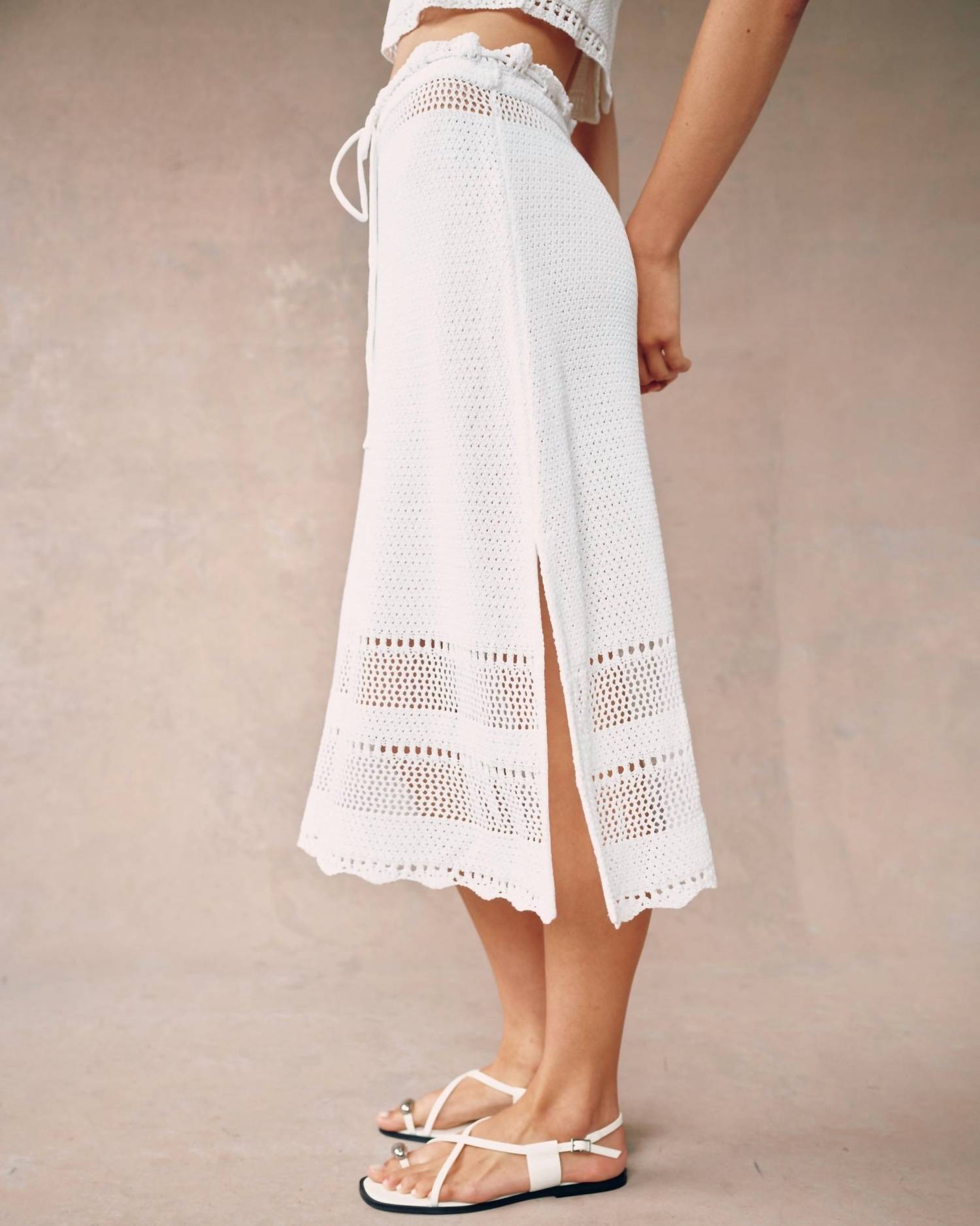 Introducing the Crochet Midi Skirt by Bella Dahl, a stylish minimalist piece perfect for your next beach day. This women's midi skirt in crisp white features a textured pattern crafted from a comfortable cotton blend, making it ideal for spring. Designed with a convenient tie closure for easy wear. Care is simple: hand wash to maintain its fresh look.