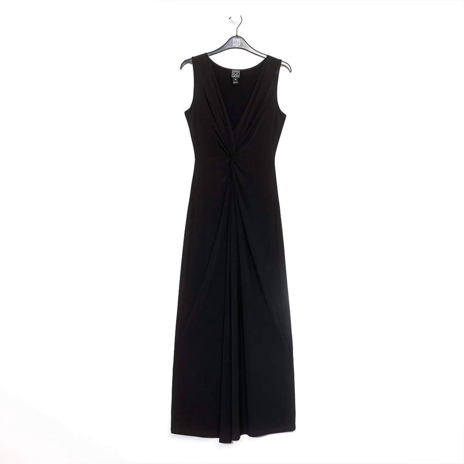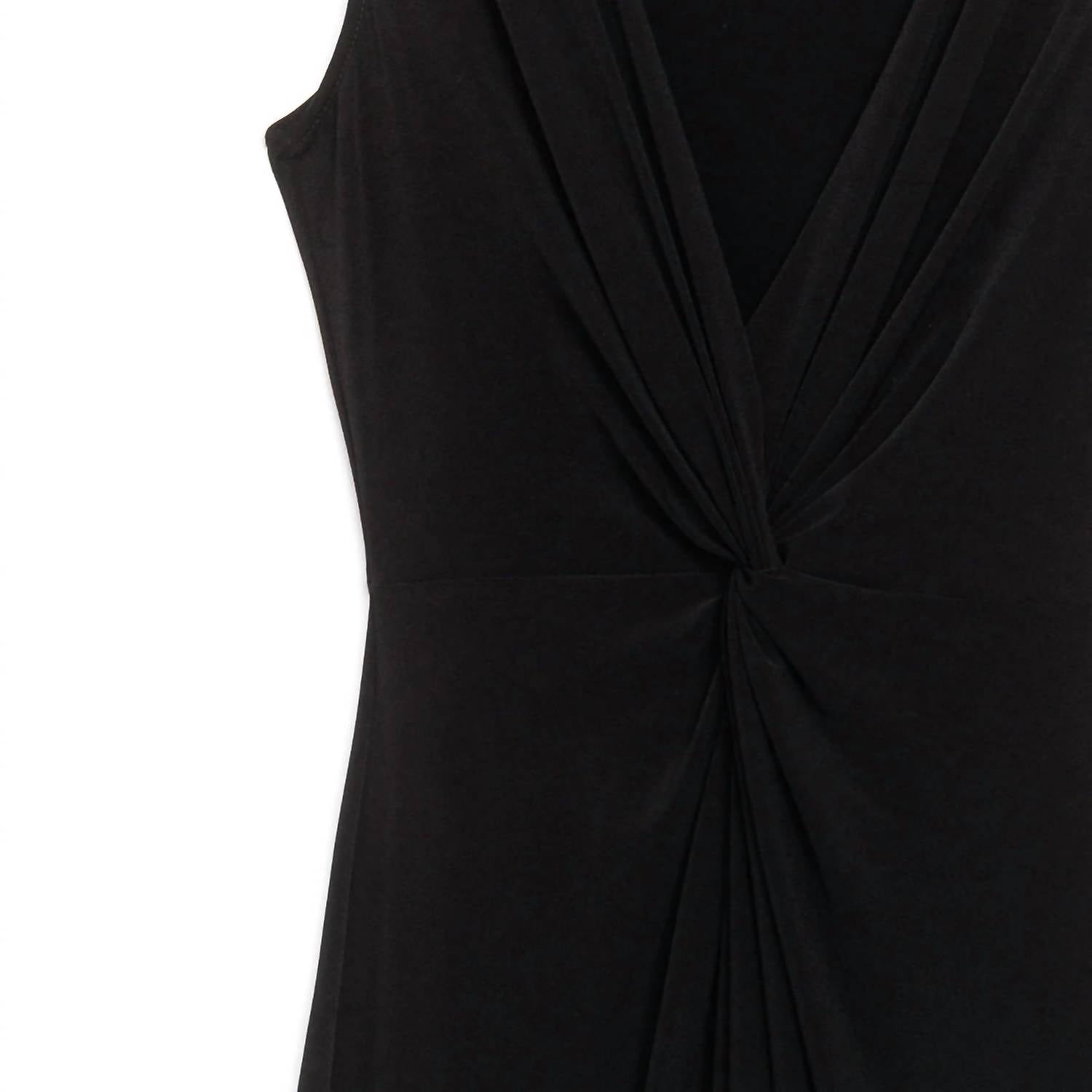 Looking for that perfect event dress? Look no further...This sleeveless dress features a deep v-neckline, wide shoulder coverage, a knotted twist bodice detail, that accentuates the waist while creating a flattering draped silhouette, with a 24" front center slit and flowing maxi hemline. Made from our signature soft stretch poly blend fibers. Easy care, quick-drying, and cooler than linen or cotton. Wrinkle free. Travel friendly. Ultra lightweight soft knit fabric. Breathable jersey like feel. 22" center front slit. Designed with a slender silhouette. Customers prefer to size up for a more relaxed fit.