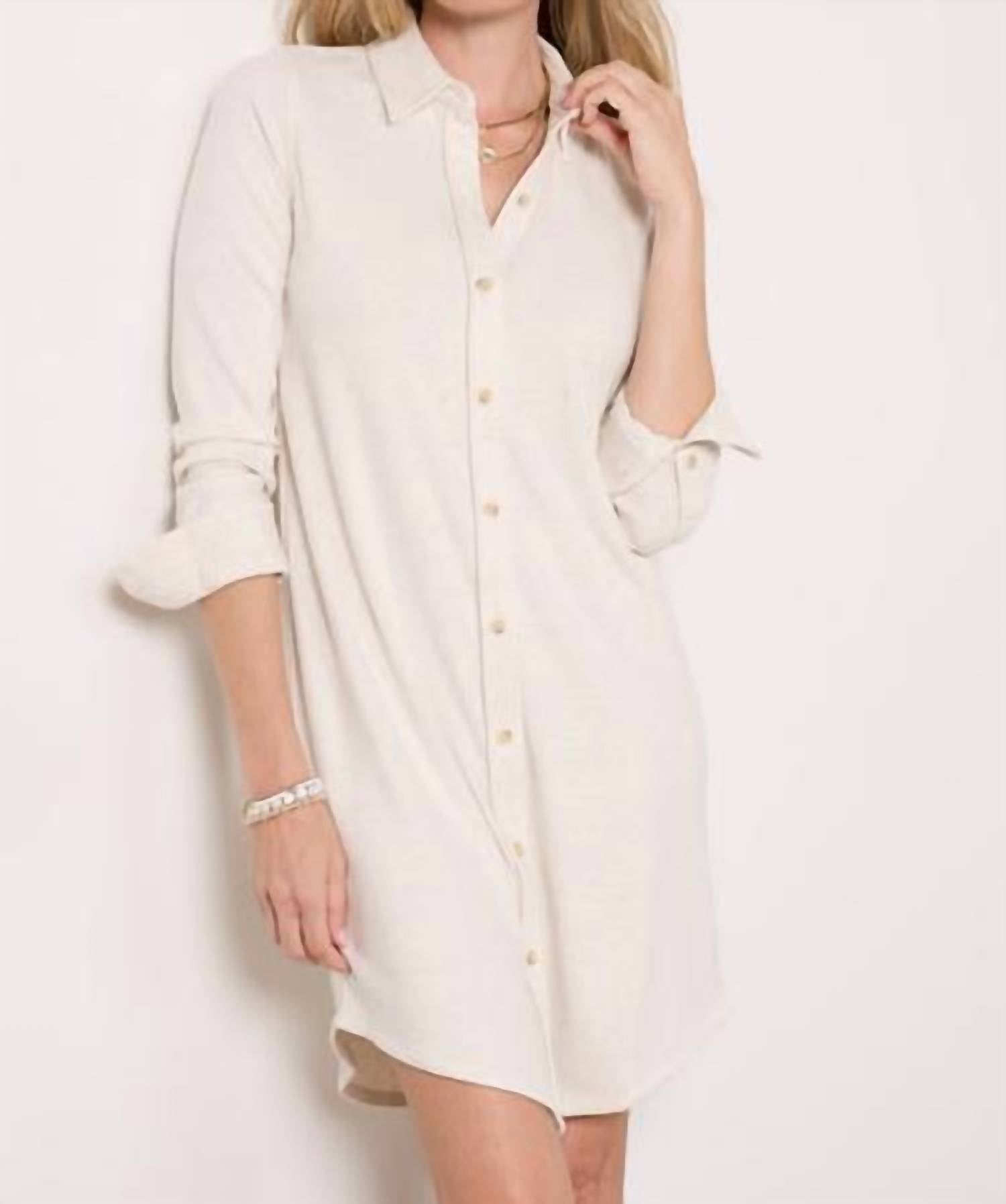 Elevate your wardrobe with the Faherty Legend Sweater Dress, available exclusively in off-white for a soft and polished look. This long-sleeve shirt dress features a spread collar, button front, and shirttail hem, while the fabric blend of 65% REPREVE® Recycled Polyester, 30% LENZING™ ECOVERO™ Viscose, and 5% Elastane ensures ultimate comfort. With a length of 36.5 inches, it boasts a slim fit through the chest and a relaxed sweep, ideal for a cozy yet chic style. Care is simple with machine wash cold, gentle cycle and tumble dry low. The model Zoe stands 5’10 and wears a size small.