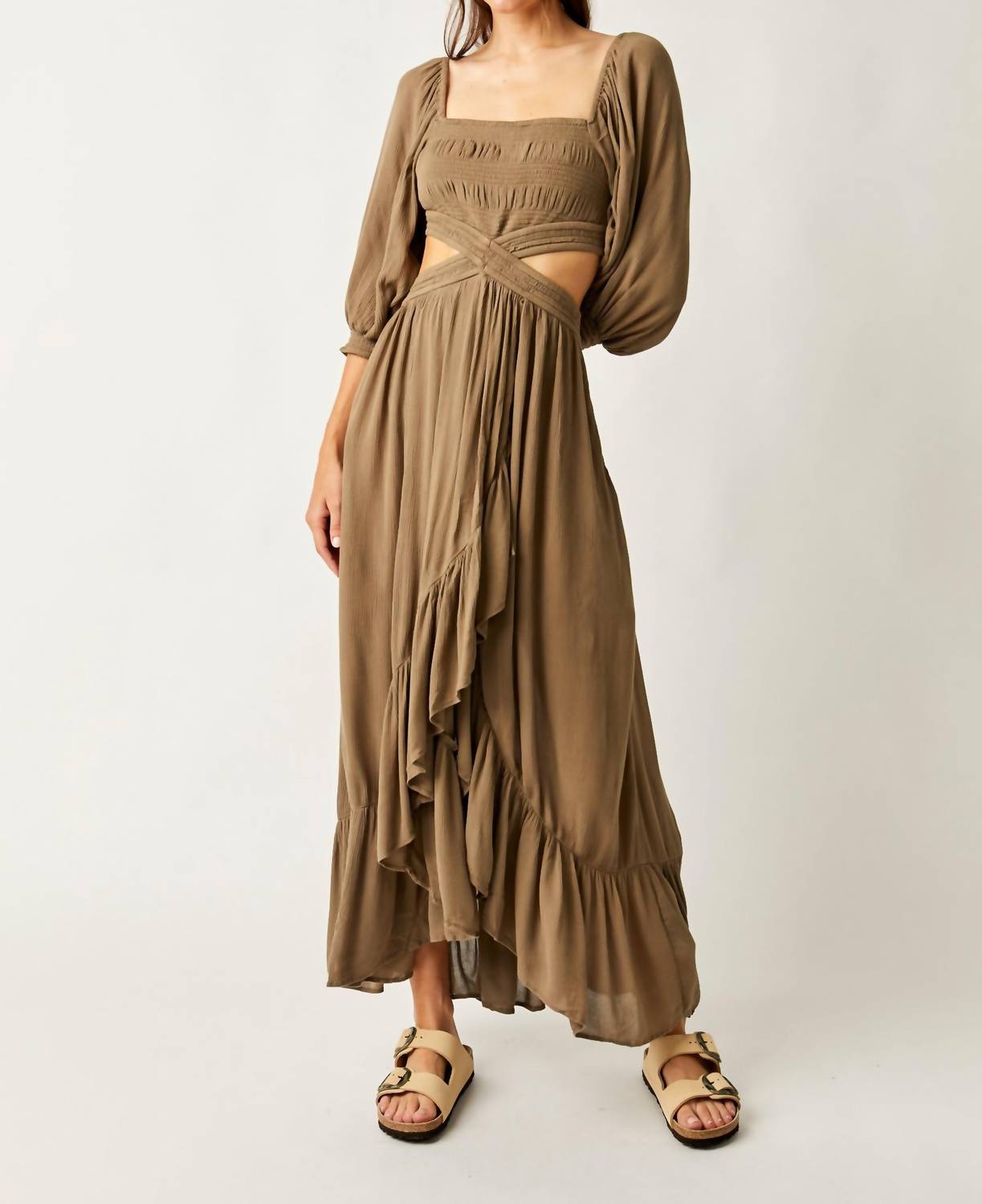 Who doesn't love a good maxi dress? This one you'll be reaching for season after season. Billowy, A-line silhouette. Smocked bodice, cross-over front feature, side cutouts, banded balloon sleeves, tiered wrap-style skirt design. Length: 52.5 in. 100% Viscose. Hand wash. Imported.