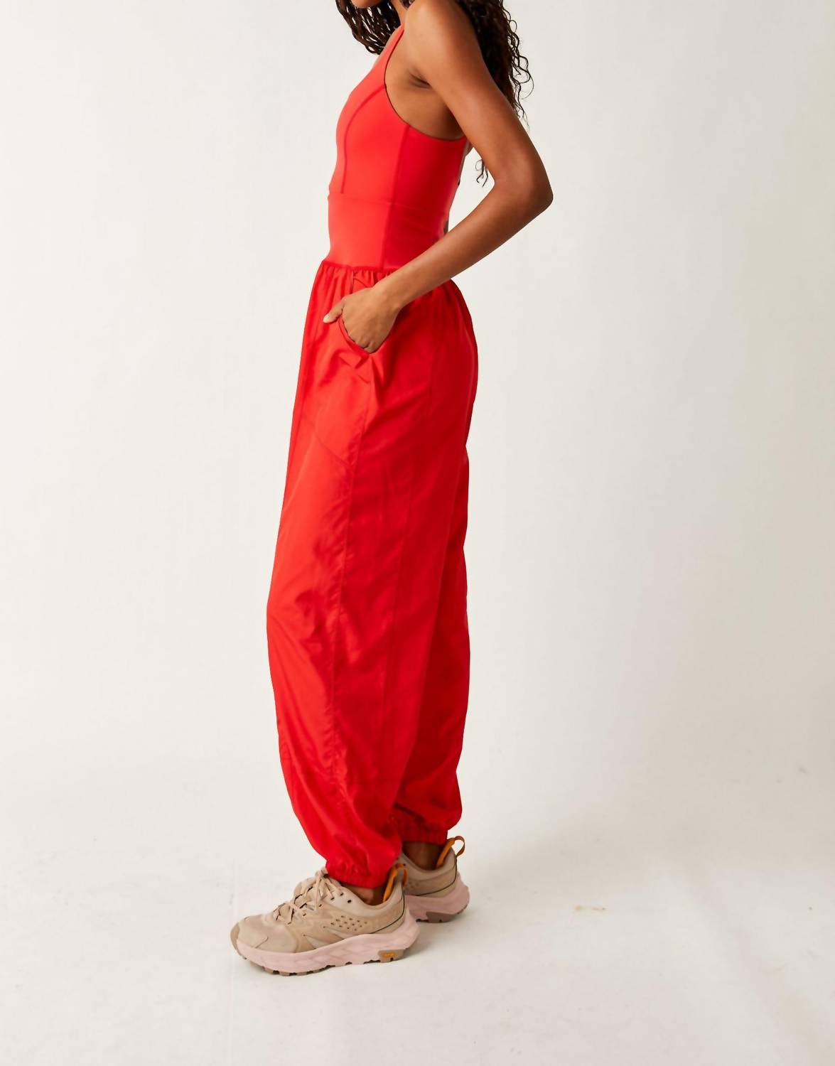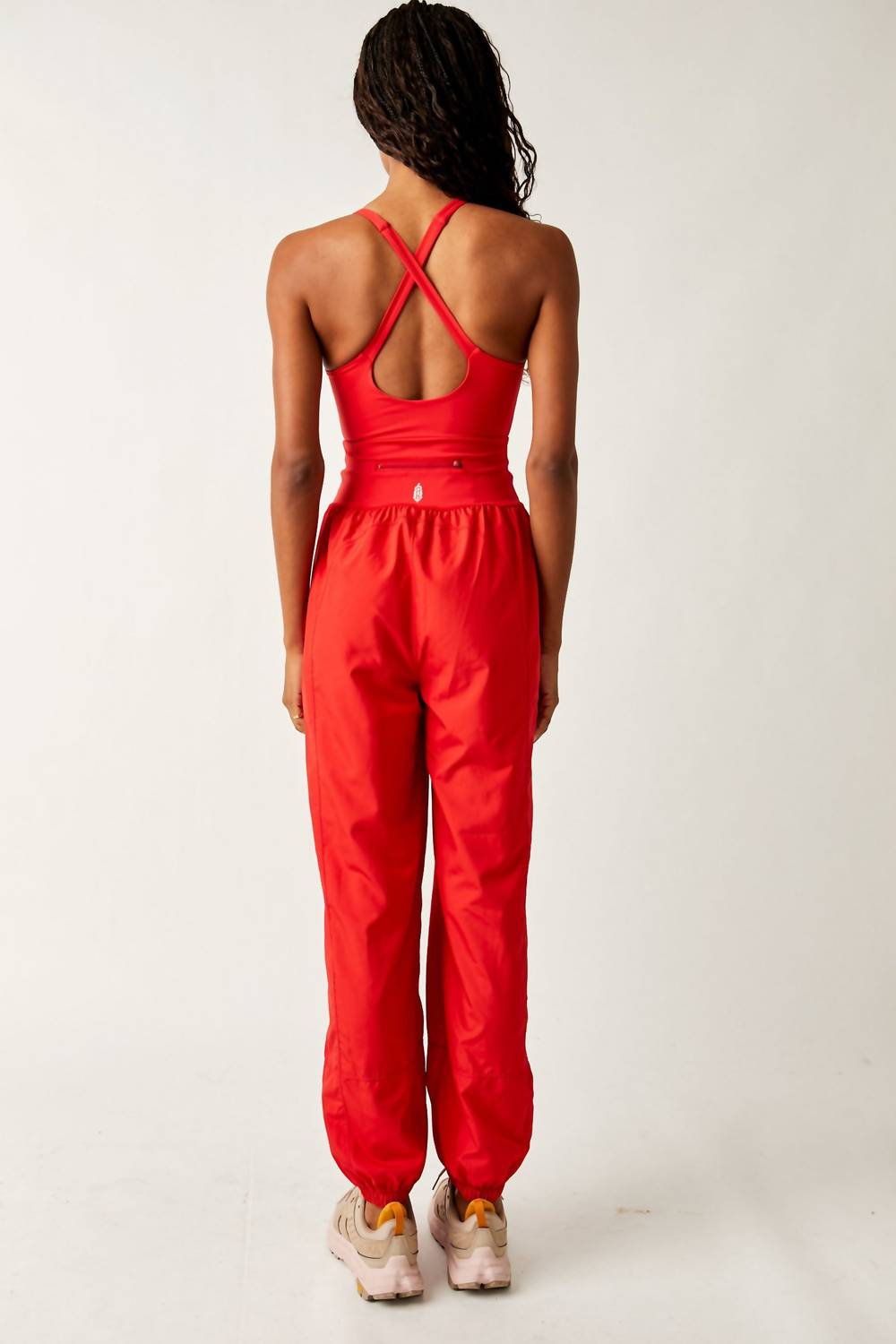 Fitted top, relaxed bottom, ankle-length. Scoop-neckline, cutout at the center, crisscross straps, pockets for hands and zippered pocket at back, cinched bottom hems. Machine wash cold. Measurements for size small: Bust: 27.5 in, Waist: 24.5 in, Hips: 43 in, Rise: 12 in, Inseam: 28.5 in.