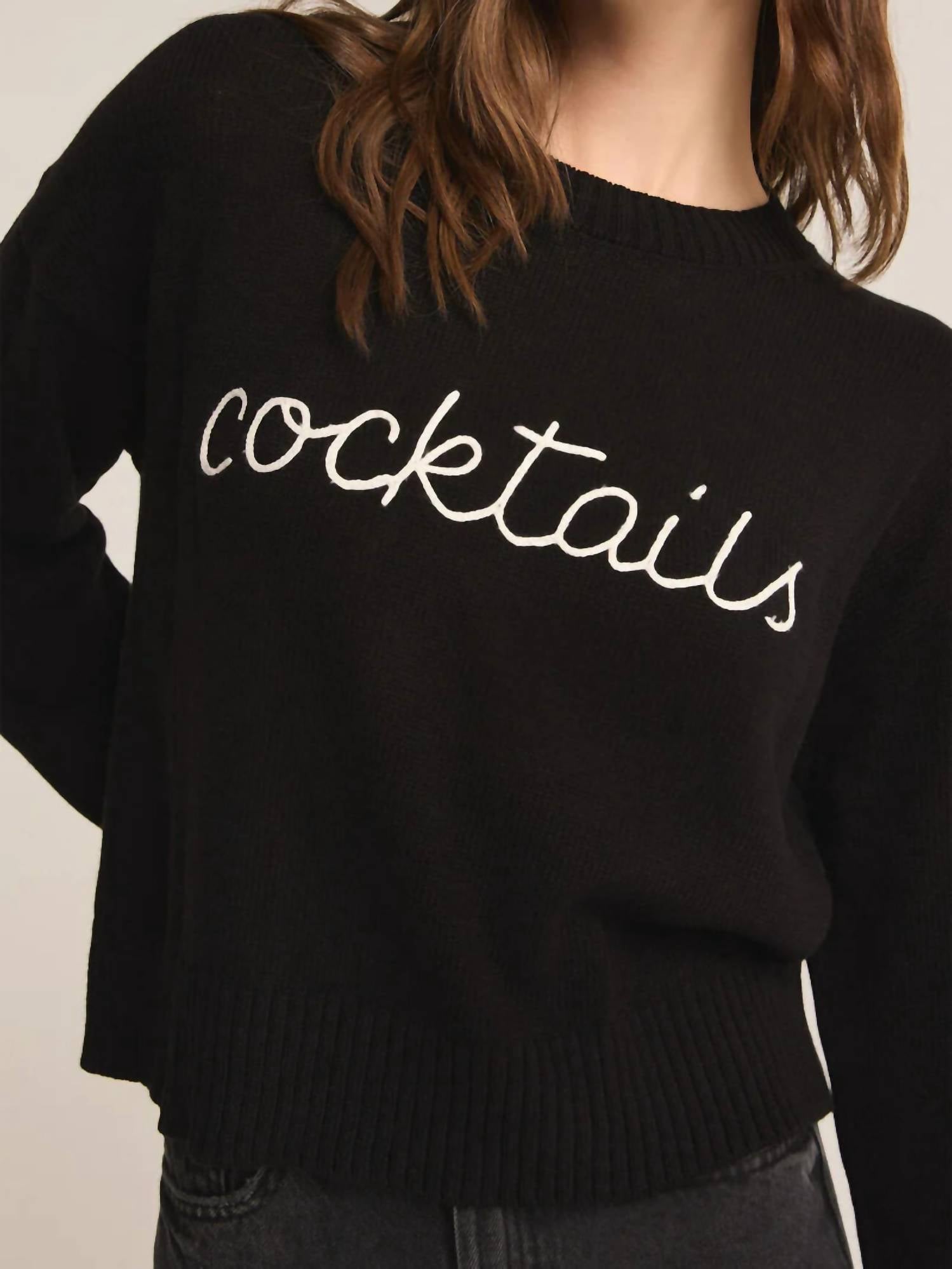 Introducing the Cocktails Sweater by Z Supply, a chic addition to any wardrobe. This black, long-sleeve sweater features delicate embroidery detailing of the word "cocktails," embodying effortless sophistication. With a classic crewneck design, this lightweight piece is perfect for making a statement on any occasion. Made for women, it is designed for both comfort and style, making it a must-have staple.
