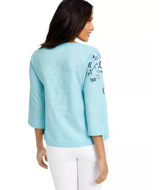 Charter Club Women's Floral-Embroidery Linen-Blend Top Blue Size Extra Large