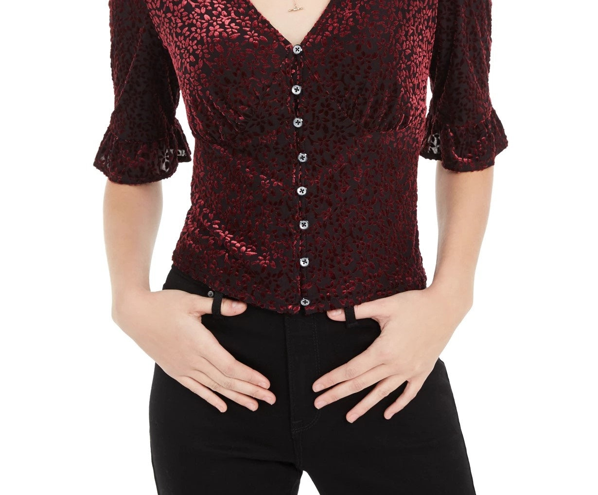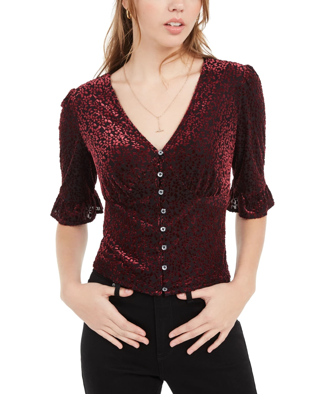 Fitted silhouette|V-neck; front button closures|Burnout velvet fabric|Short puffed sleeves with ruffle cuffs|Polyester