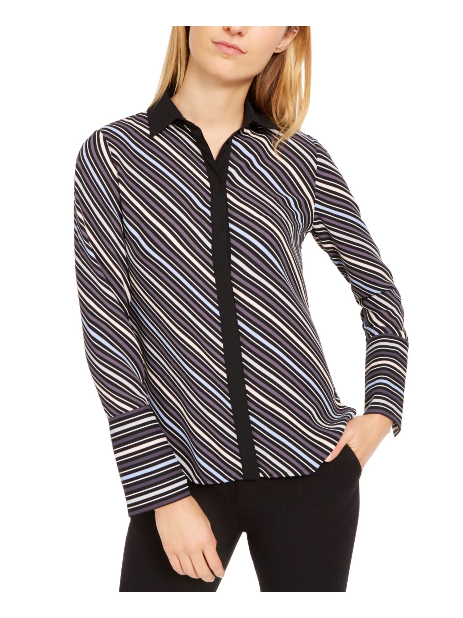 Anne Klein Women's Striped Long Sleeve Collared Top Black Size Large