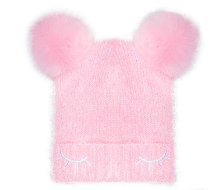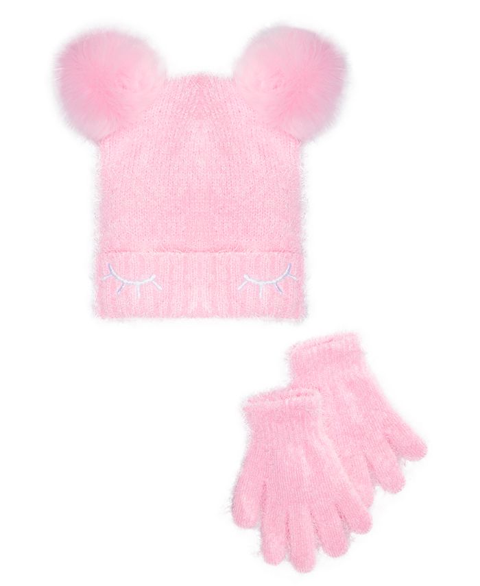 Fluffy| faux-fur pom-poms turn up the cuteness on the adorable hat in ABG's set| which also includes a matching pair of gloves.| Hat: double faux-fur pom-poms at top; eyelash detail at brim| Gloves: ribbed cuffs| Hat: polyester; faux fur: acrylic; gloves: acrylic/polyester/spandex| Hand wash