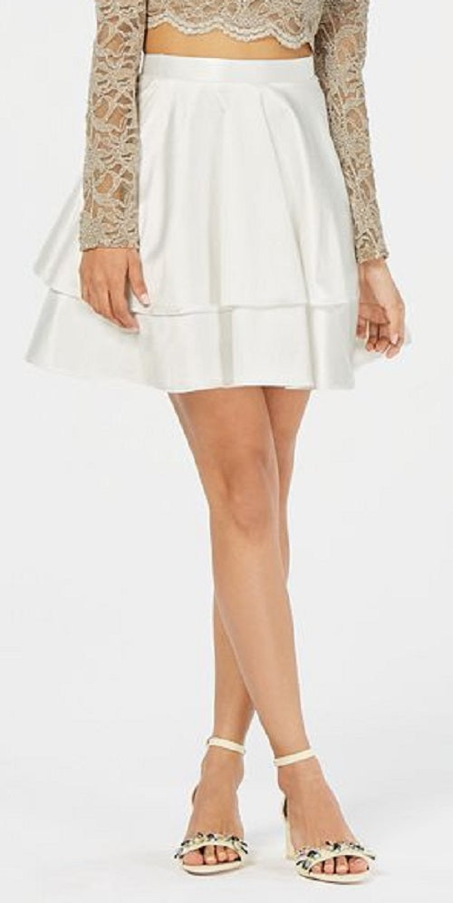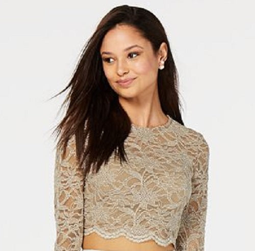City Studio's two-piece dress pairs a shimmery| long-sleeve lace bodice and flared tiered skirt| further accentuated with a hint of skin.| Top; hits at midriff| Skirt; short length| back zipper closure