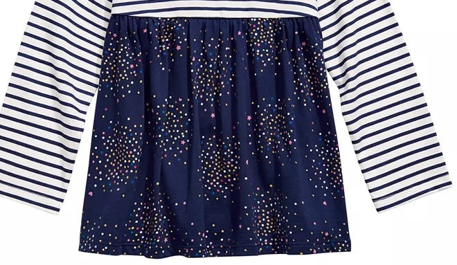 Round neck|Striped bodice and sleeve with glitter graphic print at left chest; confetti print at skirt|100% cotton|Machine washable|Imported