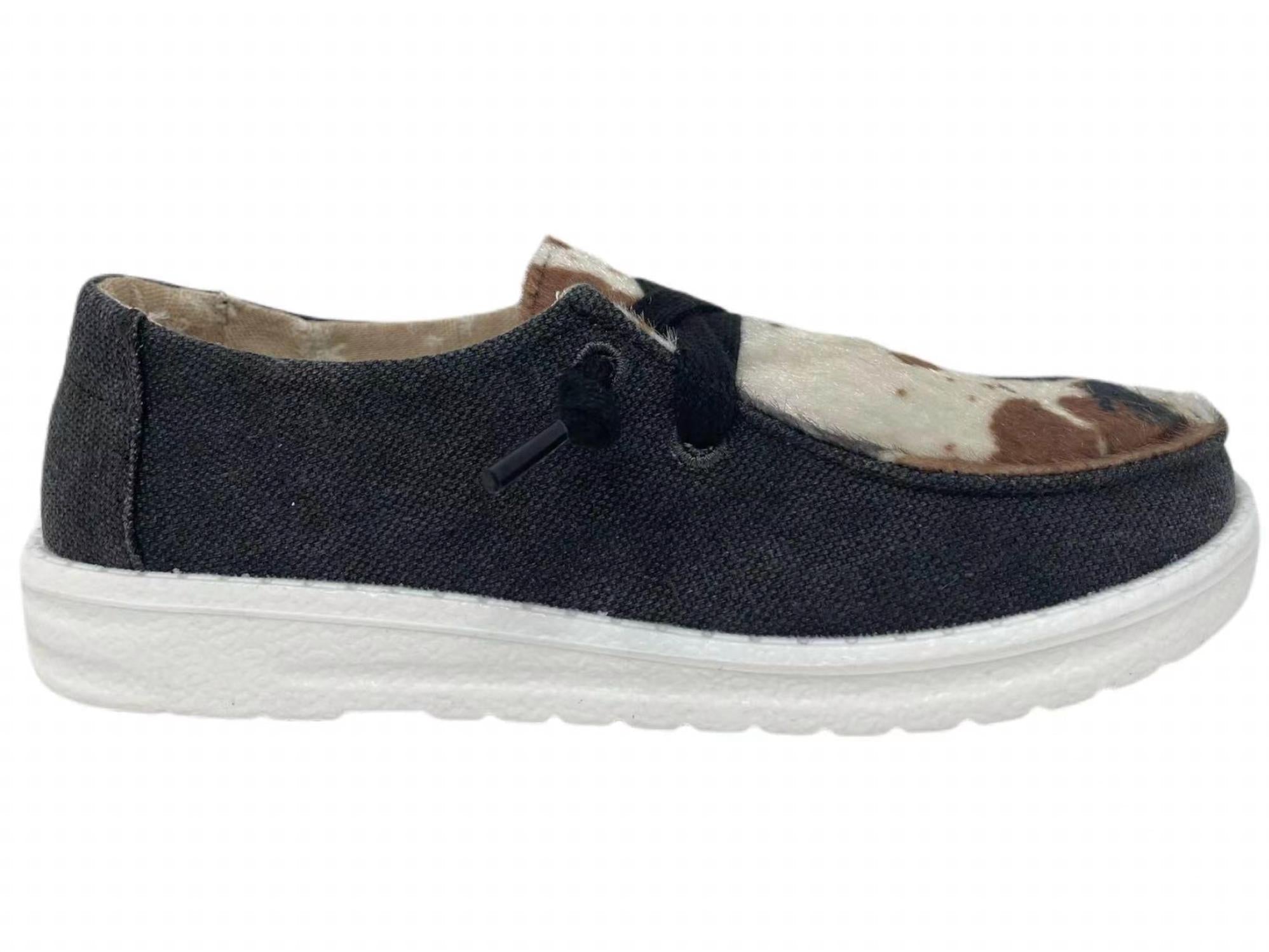 The Gypsy Jazz Kid's "Lil Mooma" Black Cow Slip On Shoes feature a breathable canvas material, black laces, and a cow print design. They have a cushioned sole with a removable insole for comfort. Note that these shoes run a size small, so it is recommended to size up one.
