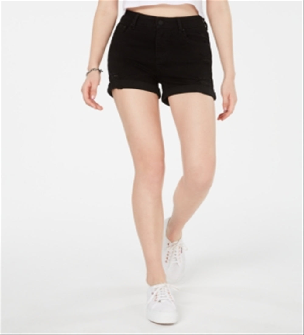 A wear-with-everything black wash makes these denim shorts from Indigo Rein a causal go-to styled with rips throughout for a fun lived-in look
