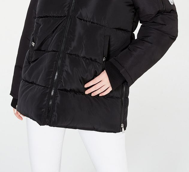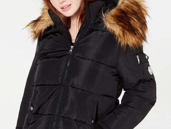 Madden Girl Junior's Hooded Faux Fur Trim Puffer Coat Black Size X-Small