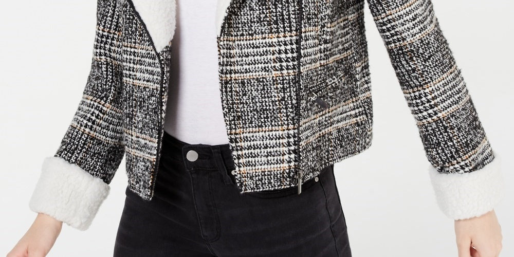 Approx. 21-1/4" long from center back to hem|Faux-shearling point collar; asymmetrical front zipper closure|Three pockets at front|Long sleeves with faux-shearling cuffs|Lined