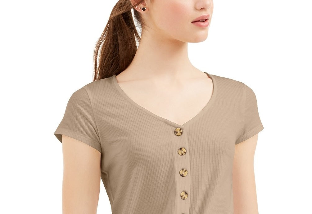 Pink Rose Juniors' Ribbed Tie-Front Top Mocha Frappe Size Small