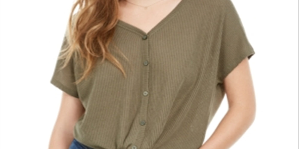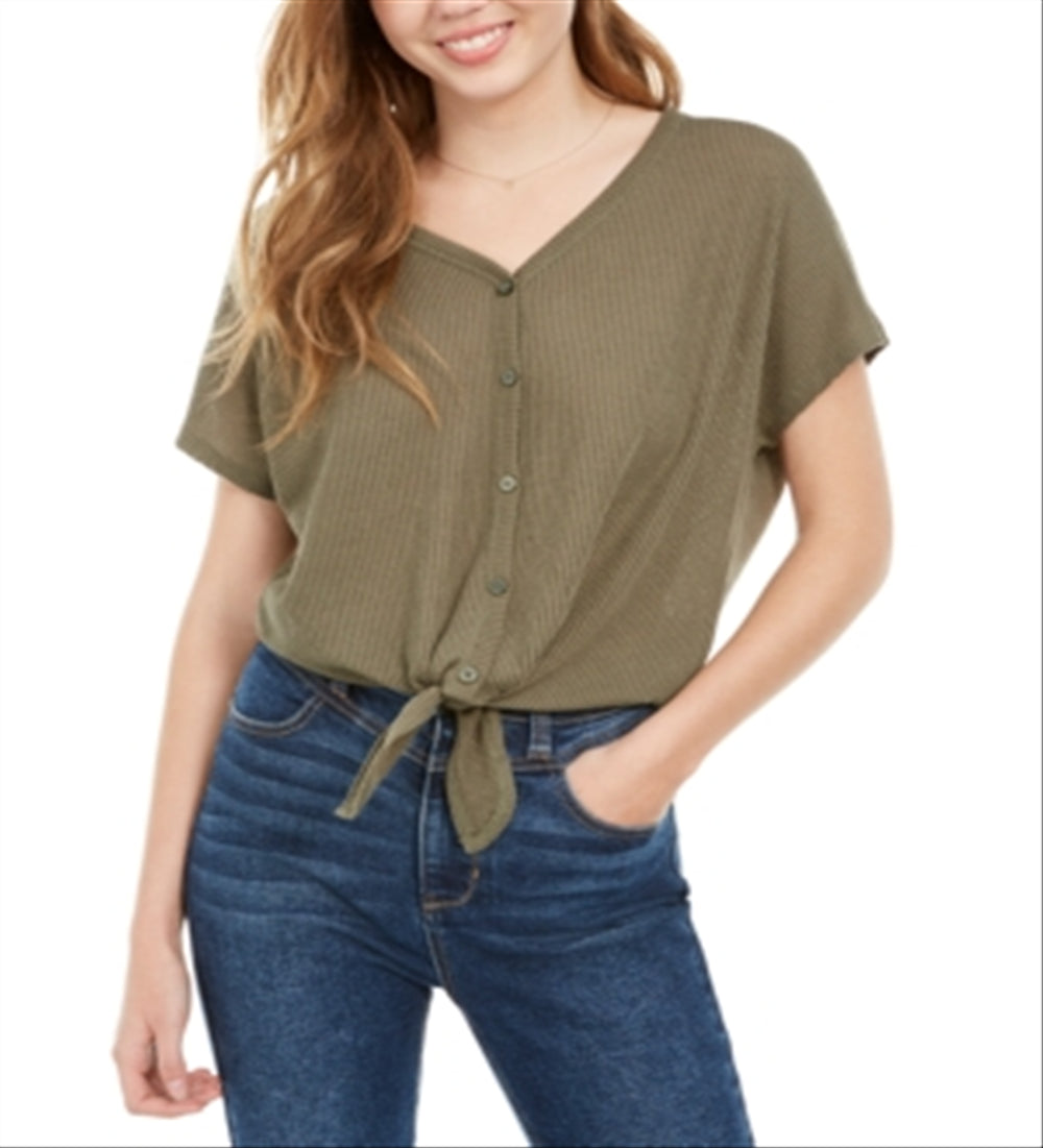 Thermal texturing takes a fresh shape in Pink Rose's soft top with dolman short sleeves and a carefree tie front