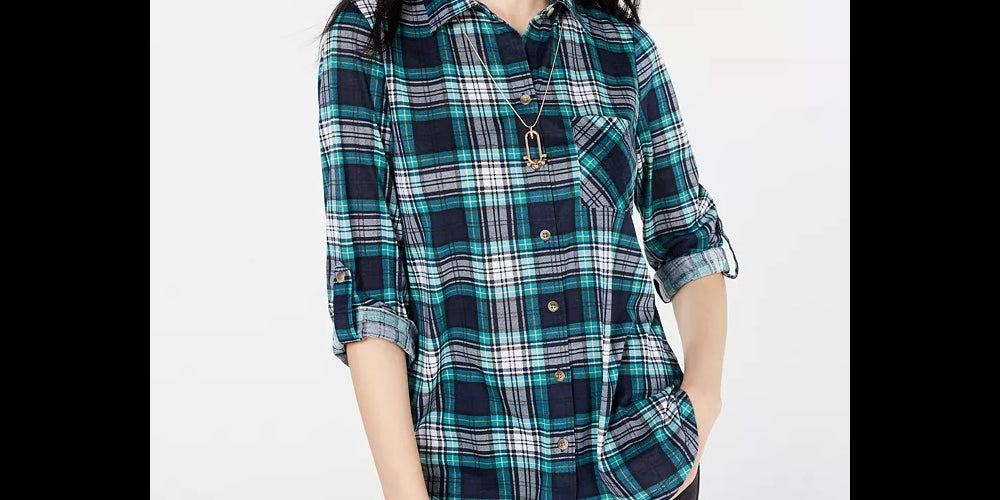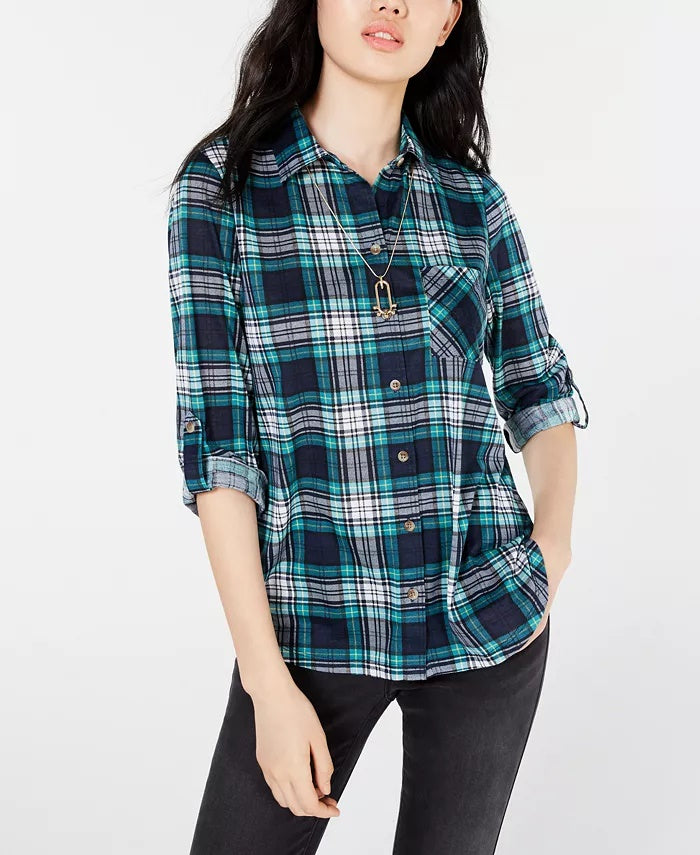 Polly & Esther Junior's Plaid Roll Tab Shirt Green/Black Size X-Large