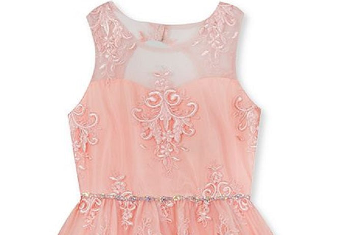 Lace illusion neckline| Back button and zipper closure| Allover lace; high-low hem