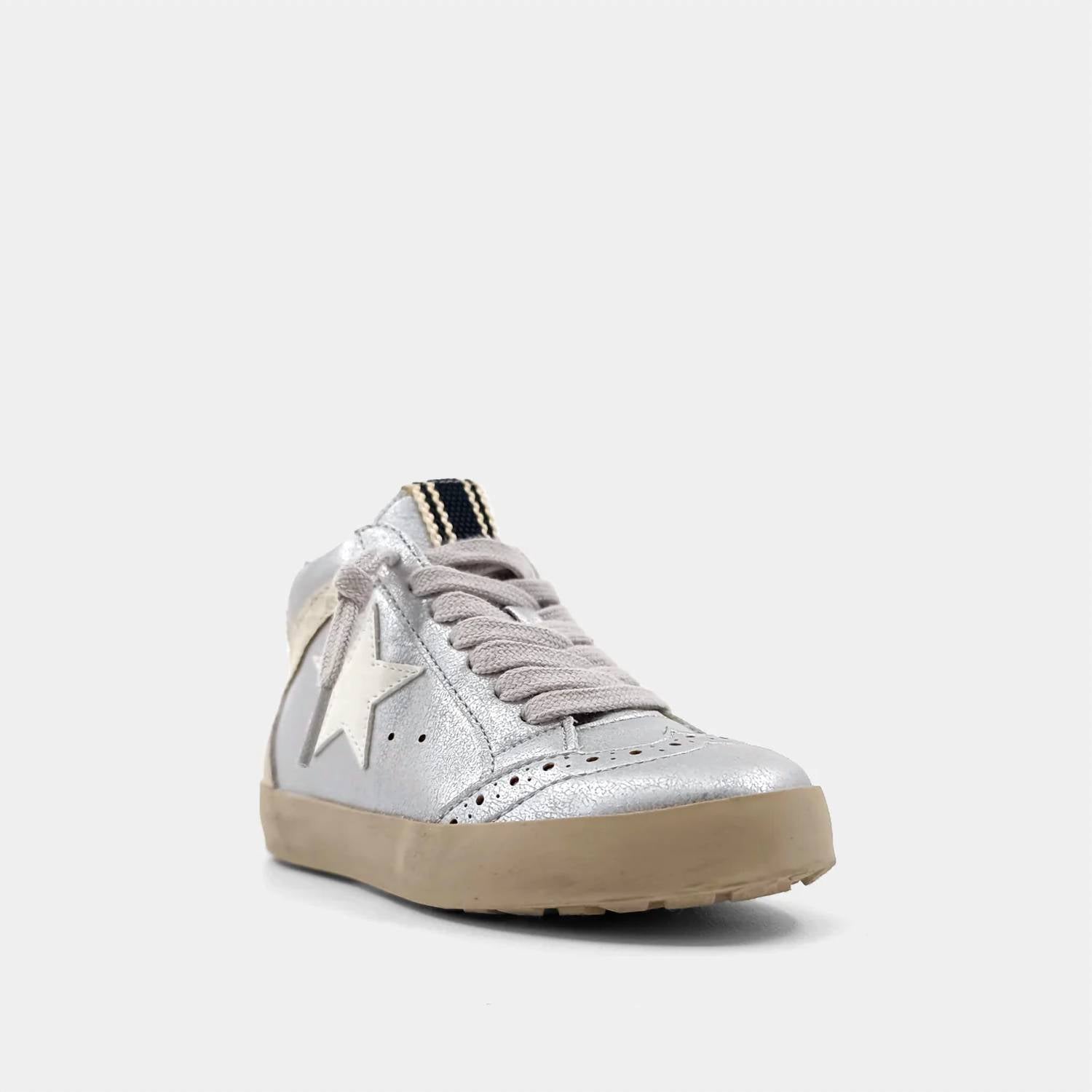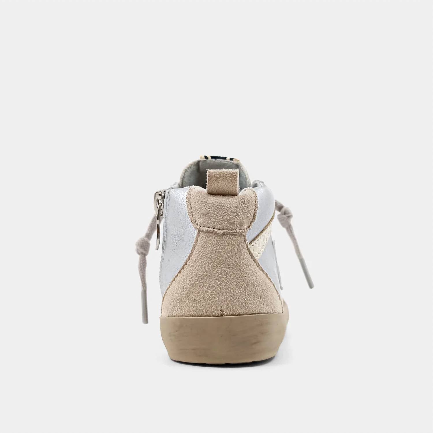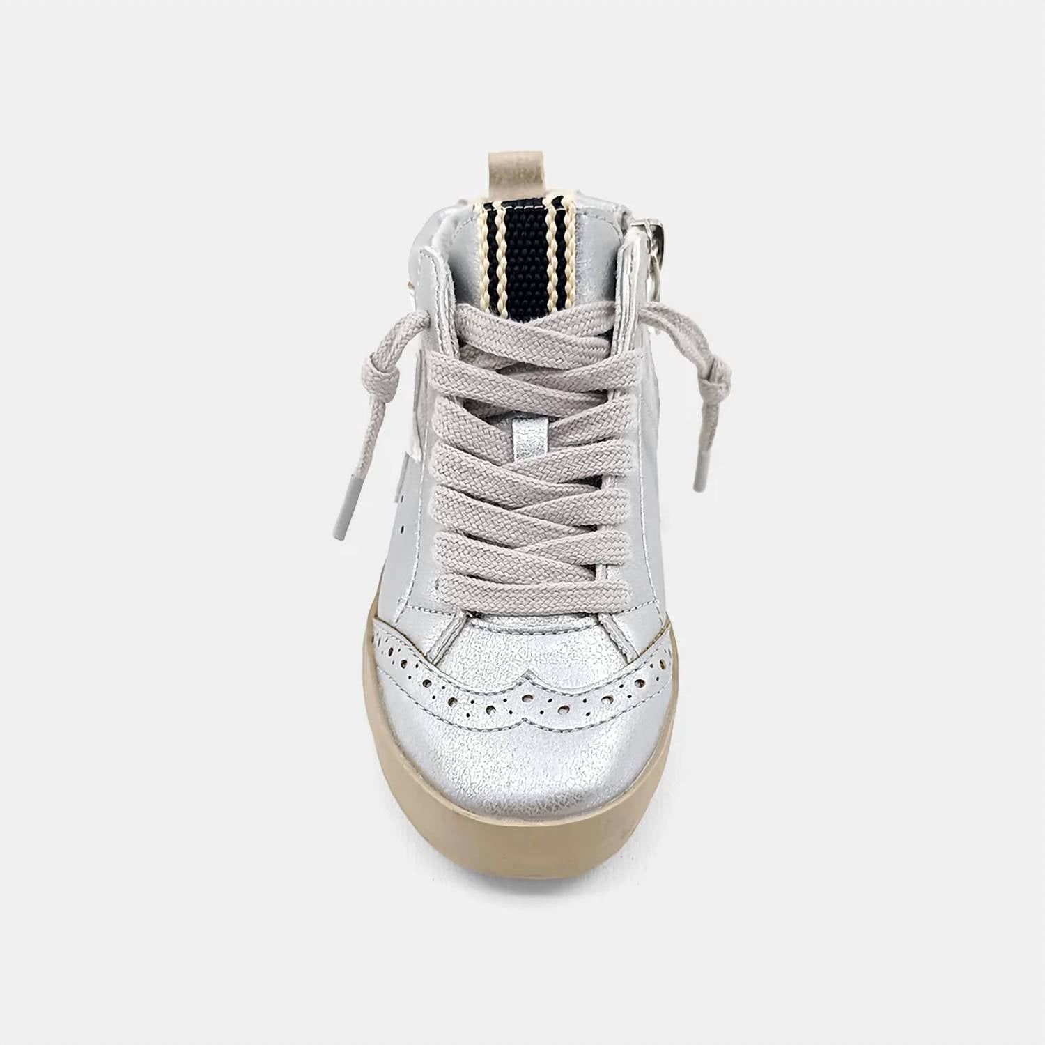 Stylish sneakers seamlessly combine vintage charm with contemporary flair. Crafted from high-quality faux leather and suede. Adorned with eye-catching metallic and feature the iconic star. Classic round toe design paired with a sturdy waffle rubber sole. Ensures that your child's comfort and durability are never compromised. Blending fashion and function in one enchanting package. Designed with little ones in mind, these sneakers are an essential for any kid who loves to shine.