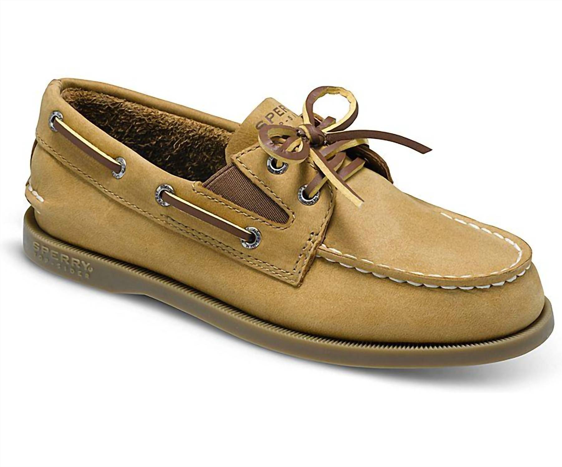 Introducing the Boy's Original Slip Ons by Sperry, crafted for classic style and ease in a Sahara shade. Made from 100% leather upper, these moccasins boast the convenience of a flat heel and medium width, ensuring comfort for little boys. The round toe design provides a timeless appeal, while the slip-on closure offers hassle-free wear. Care for this stylish footwear by removing laces, cleaning the leather with a specialized cleaner, and allowing the laces to air dry.