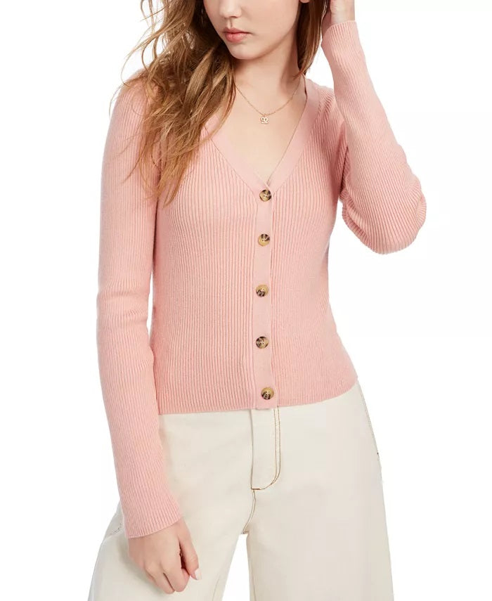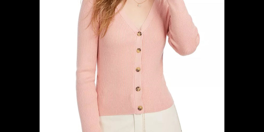Ultra Flirt Junior's Cropped Ribbed Cardigan Sweater Peach Beige Size Large