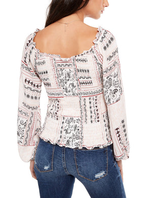 American Rag Juniors' Printed Smocked Poet-Sleeved Blouse White Size Medium