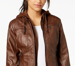 Maralyn & Me Junior's Hooded Faux Leather Moto Jacket Brown Size X-Small