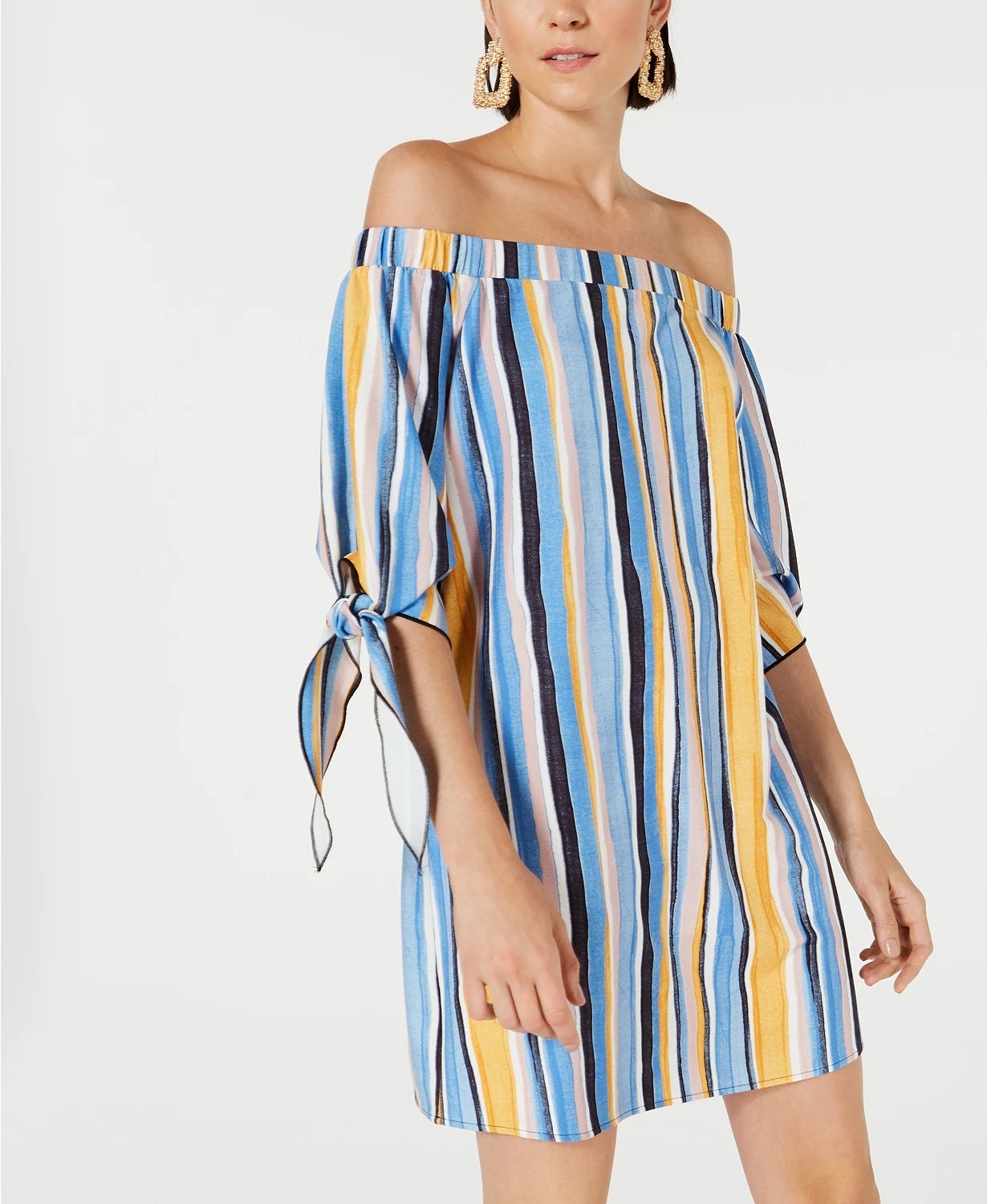 Approx. 30-1/4" long from off-the-shoulder center back neck to hem|Straight off-the-shoulder neckline|Pullover styling|3/4-sleeves with knotted ties|Unlined