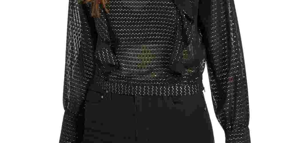 Approx. length: 18-5/8"|Crewneck; zipper closure at side|Allover metallic dot; ruffle trim at front|Long blouson sleeves; cinched cuffs|Semi-sheer; unlined