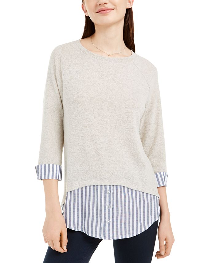 Scoop neck| Marled fuzzy fabric | Front faux layer with button trim
