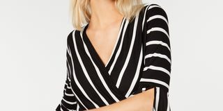 BCX Juniors' Stretch Tie Split Cuff Striped Bell Sleeve Surplice Neckline Evening Wrap Top Black/White Size X-Small